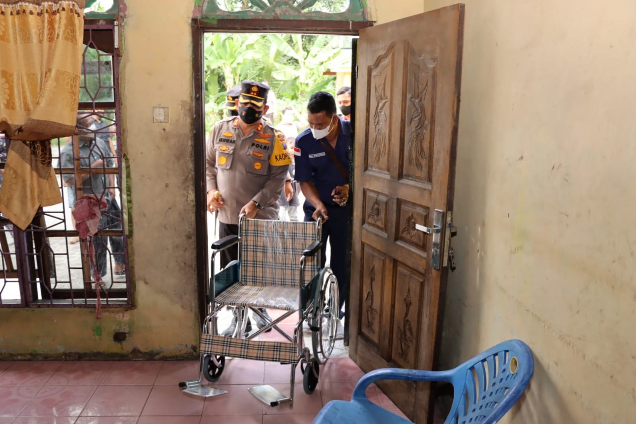 Rombongan Kapolres Batu Bara AKBP Ikhwan Lubis, S.H, M.H, Kamis (06/01/2022) Jam, 10.00 Wib memberikan bantuan kursi roda kepada Bapak Hadri 67 Tahun Warga Dusun Simpang Galon, Desa Pakam, Kecamatan Madang Deras, Kabupaten Batu Bara yang mengalami Strok berat selama 3 Tahun.