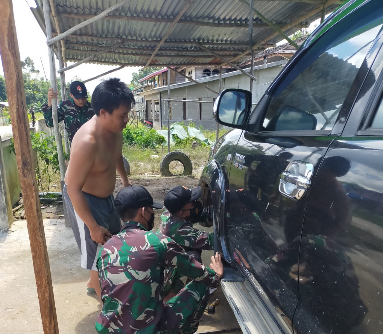 Anggota Satgas Pamtas RI-Malaysia Yonif 144/JY bantu perbaiki mobil Warga yang rusak di desa Langau Kecamatan Puring Kencana Kabupaten Kapuas Hulu Kalbar.