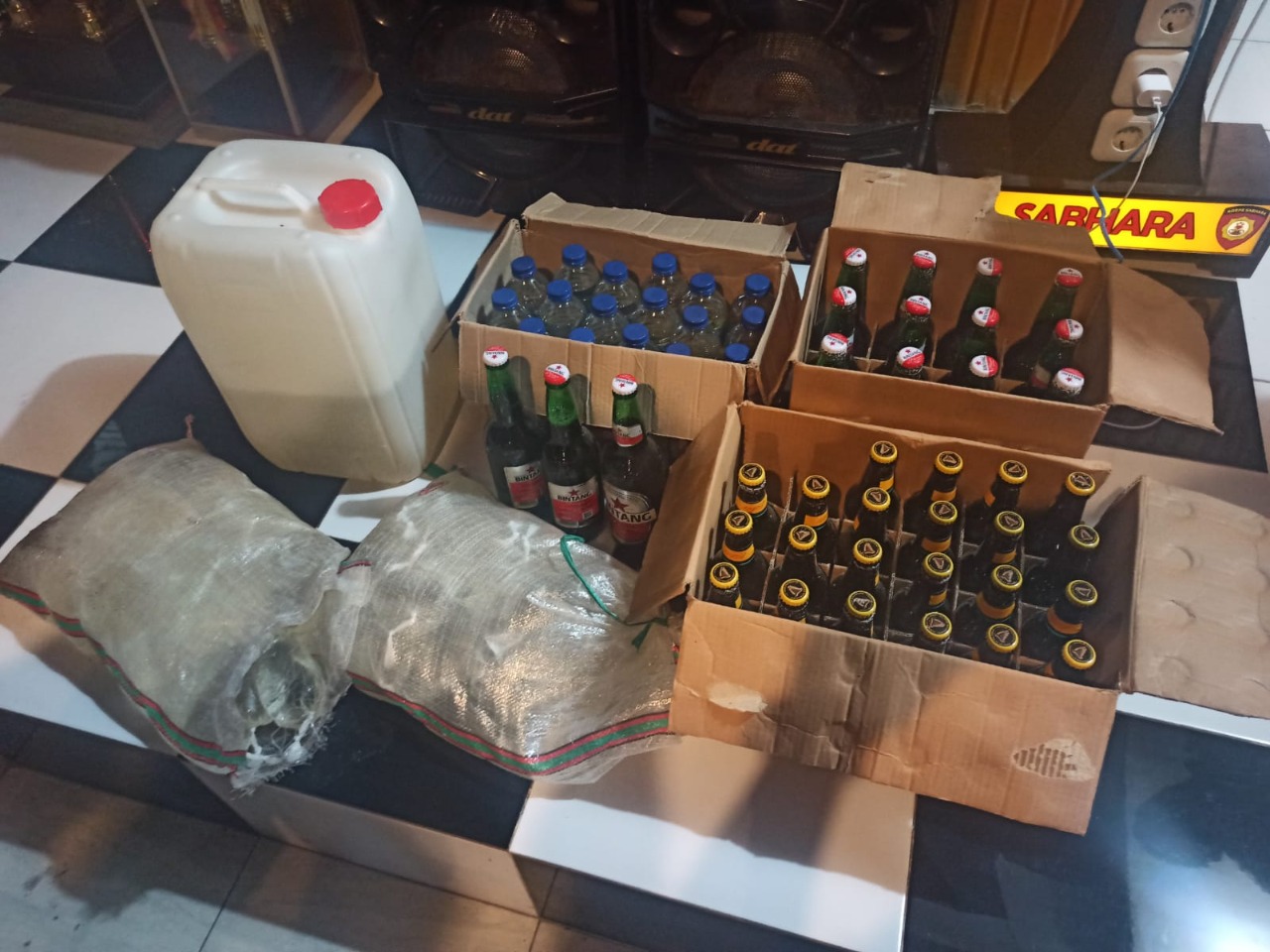 “Adapun barang bukti yang diamankan cap tikus 17 botol ukuran 600 ml, 60 kantong, 1/2 jerigen ukuran 20 liter, 22 botol Bir Bintang dan 17 botol Bir Guinnes,” beber perwira pangkat tiga balak ini.