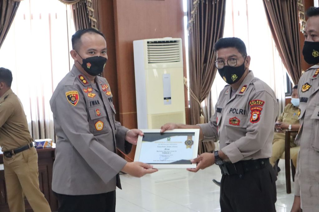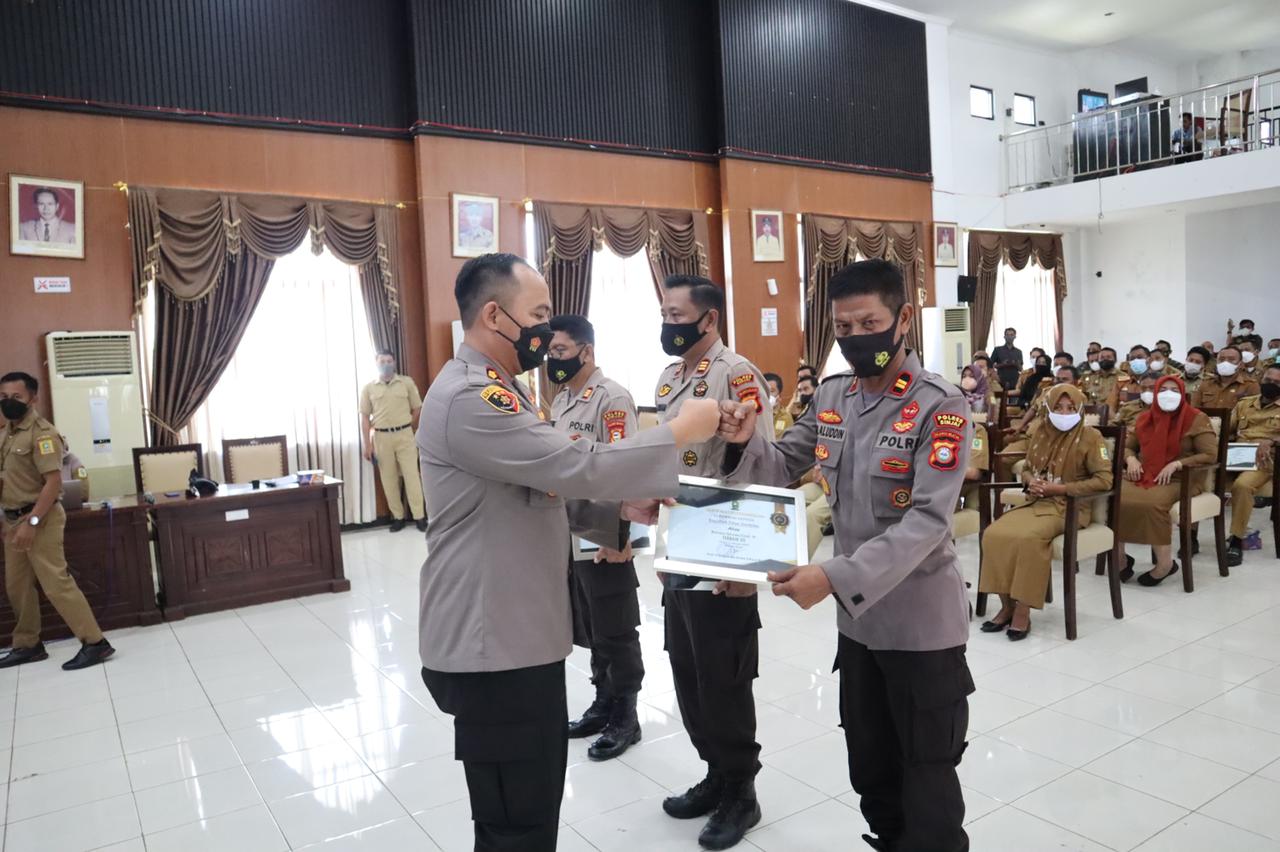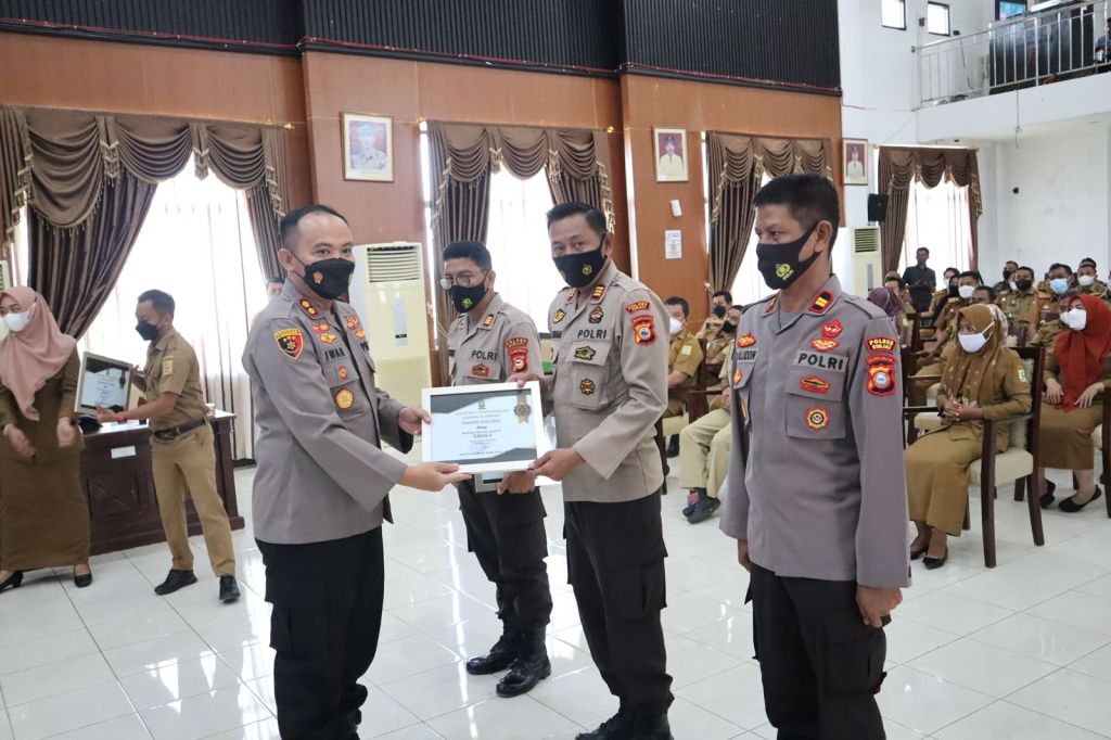 Pada kegiatan tersebut, Kapolres Sinjai Akbp Iwan Irmawan, S.Ik., M.Si turut menyerahkan penghargaan kepada para Kapolsek, dan unsur tripika lainnya serta pimpinan organisasi Daerah yang telah ikut menyukseskan program Nasional Vaksinasi Covid-19 diwilayah Kabupaten Sinjai.
