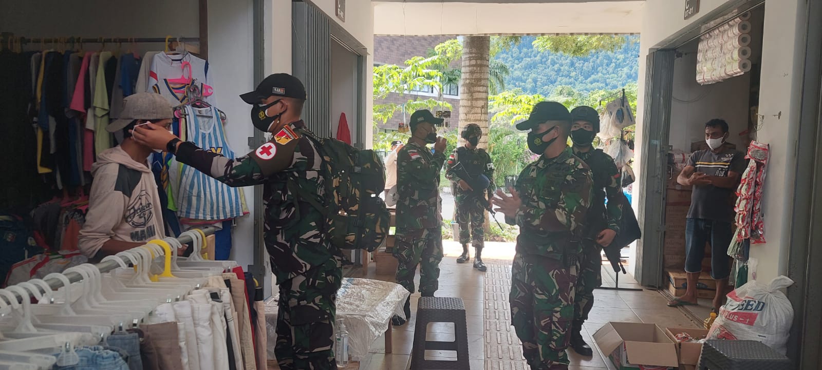 Satgas Pamtas RI-PNG Yonif 711/Rks Khususnya Pos Kotis, melaksanakan kegiatan pembagian masker dan sosialisasi protokol kesehatan pencegahan Covid-19 di area perbatasan Pasar Skouw, kel. Skouw Sae, Distrik Muara Tami, Kota Jayapura, Minggu (10/01/2022).