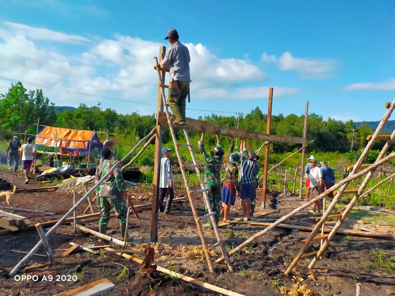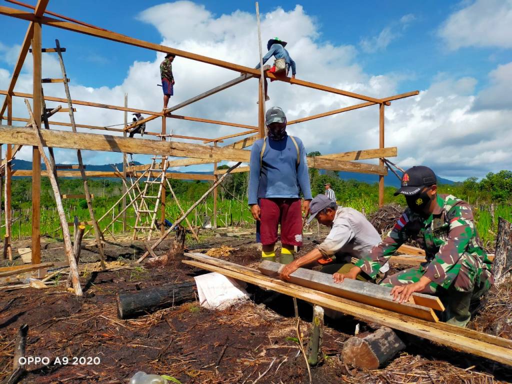 Anggota Satgas Pamtas RI-Malaysia Yonif 144/JY melaksanakan gotong royong pembuatan Rumah warga di desa Langau Kecamatan Puring Kencana Kabupaten Kapuas Hulu Kalbar.