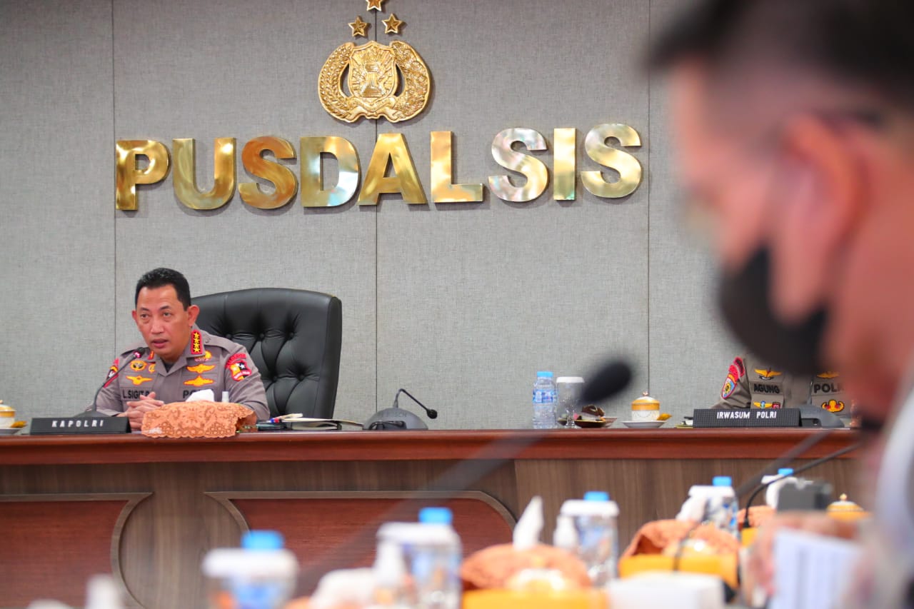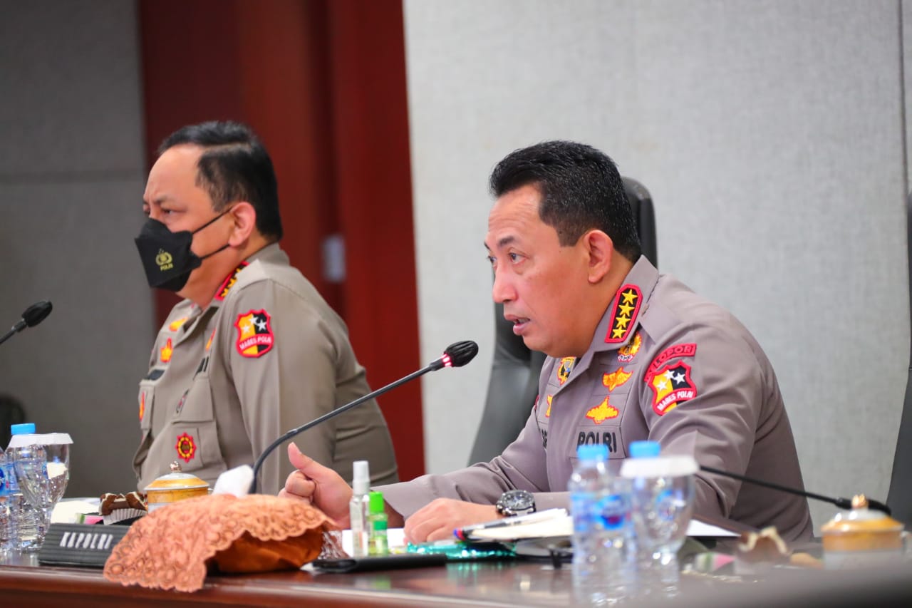 Kapolri Jenderal Listyo Sigit Prabowo menggelar Video Conference (Vicon) analisa dan evaluasi kepada seluruh jajaran di Mabes Polri, Jakarta Selatan. Dalam kegiatan itu, Ia juga memberikan arahan untuk menjadi institusi Korps Bhayangkara kedepannya semakin dicintai dan diharapkan oleh masyarakat.