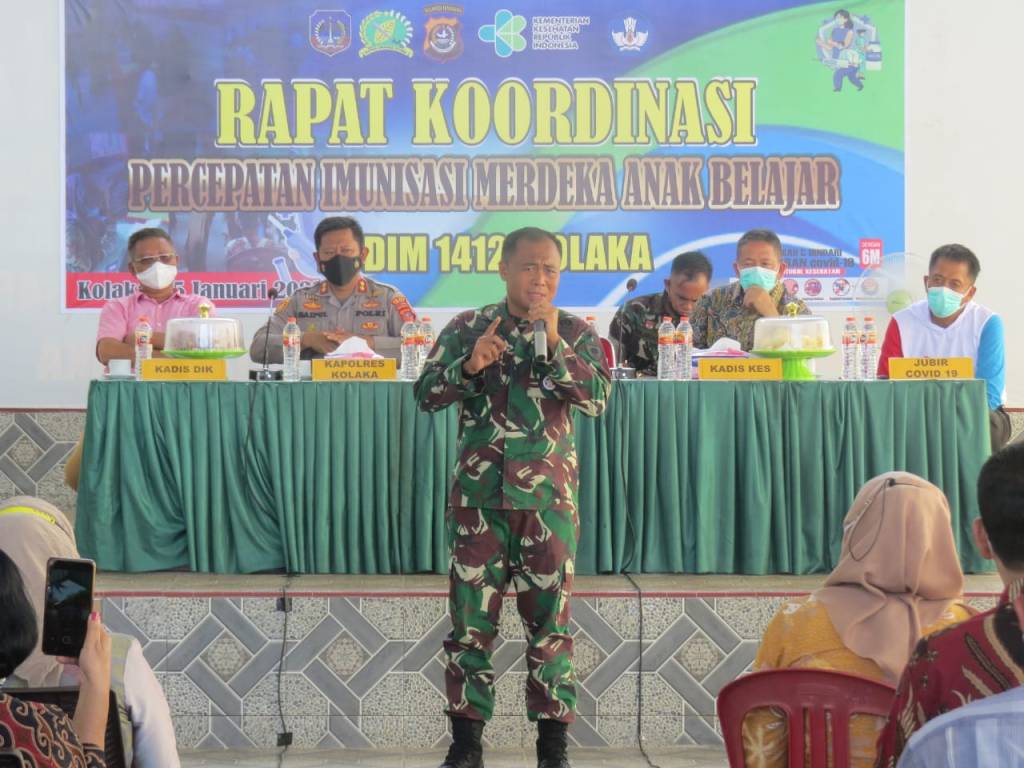 Guna mempercepat Imunisasi Merdeka Anak belajar di Kabupaten Kolaka, Kodim 1412/Kolaka gelar rapat kordinasi. Bertempat di Aula Larumbalangi Kodim 1412/Kolaka Jl. Pemuda Kel, Balandete Kec, Kolaka. Kab, Kolaka. Sulawesi Tenggara (Sultra). Sabtu (15/1/2022).