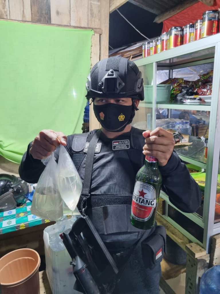 Dari penggeledahan di dua lokasi tersebut, anggota Tim Tarantula Satuan Sabhara Polres Banggai berhasil menemukan barang bukti miras.