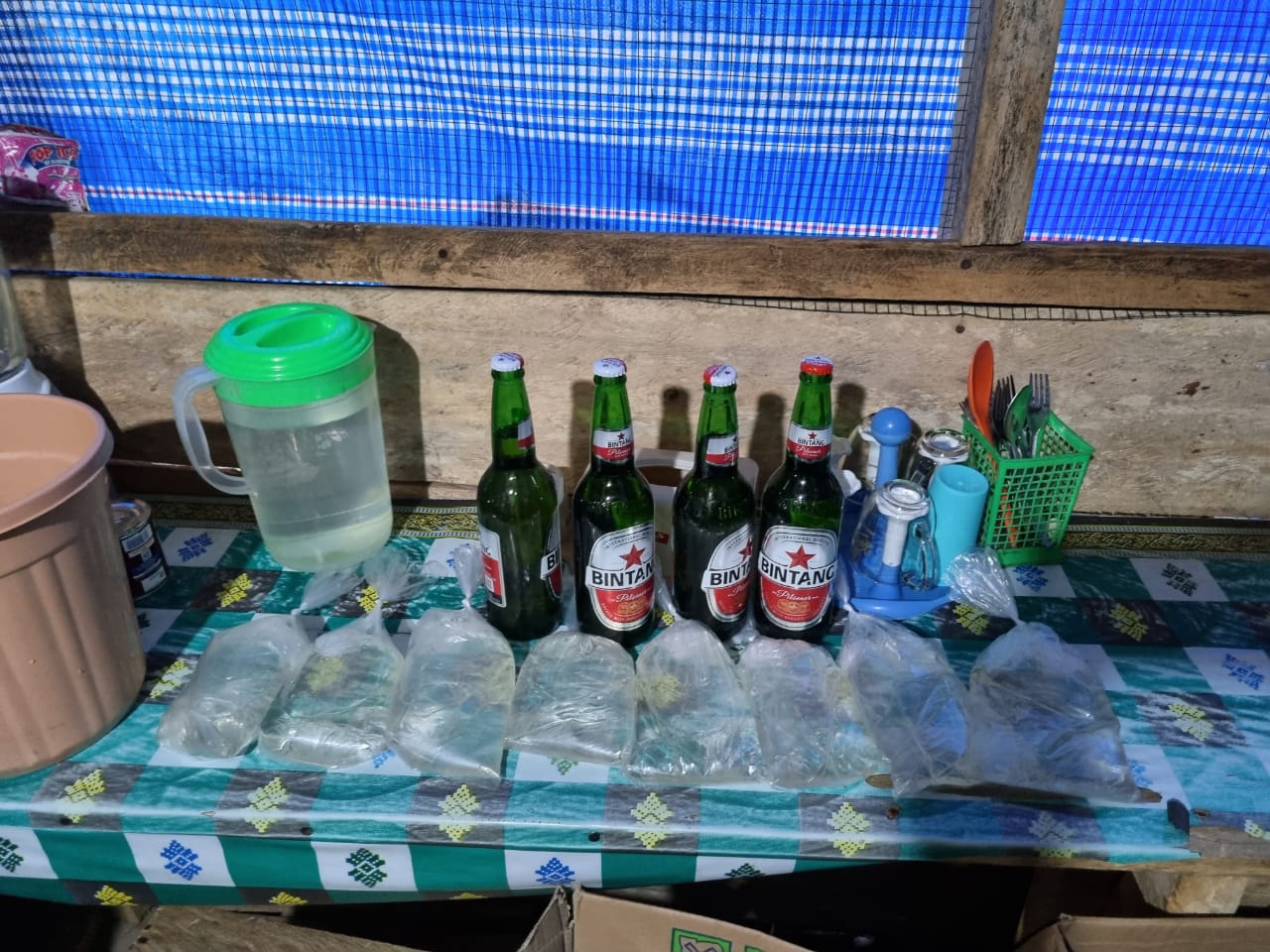 Adapun barang bukti yang diamankan petugas yaitu, delapan kantong miras cap tikus, 5 botol bintang, empat kaleng bir guinnes dan dua botol bir guinnes.