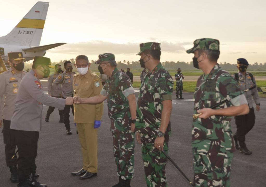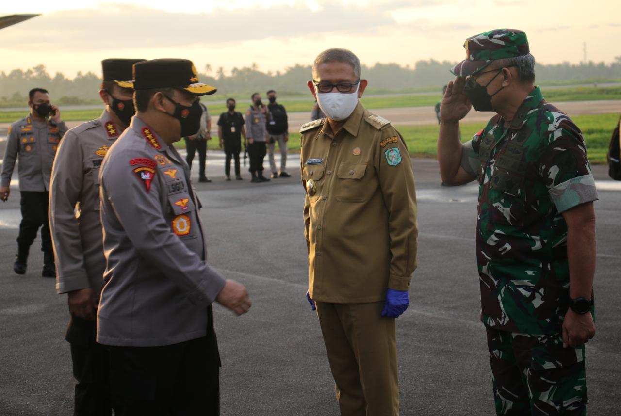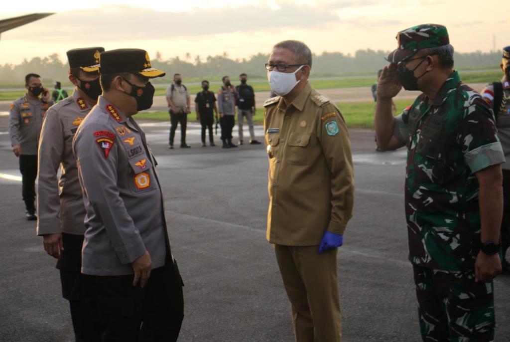 Kepala Staf Kodam (Kasdam) XII/Tanjungpura, Brigjen TNI Djauhari, S.E. M.M., bersama Forkopimda Provinsi Kalimantan Barat dan PJU Polda Kalbar menyambut kedatangan Kapolri, Drs. Listyo Sigit Prabowo M.Si., di Bandara Lanud Supadio, Kubu Raya.