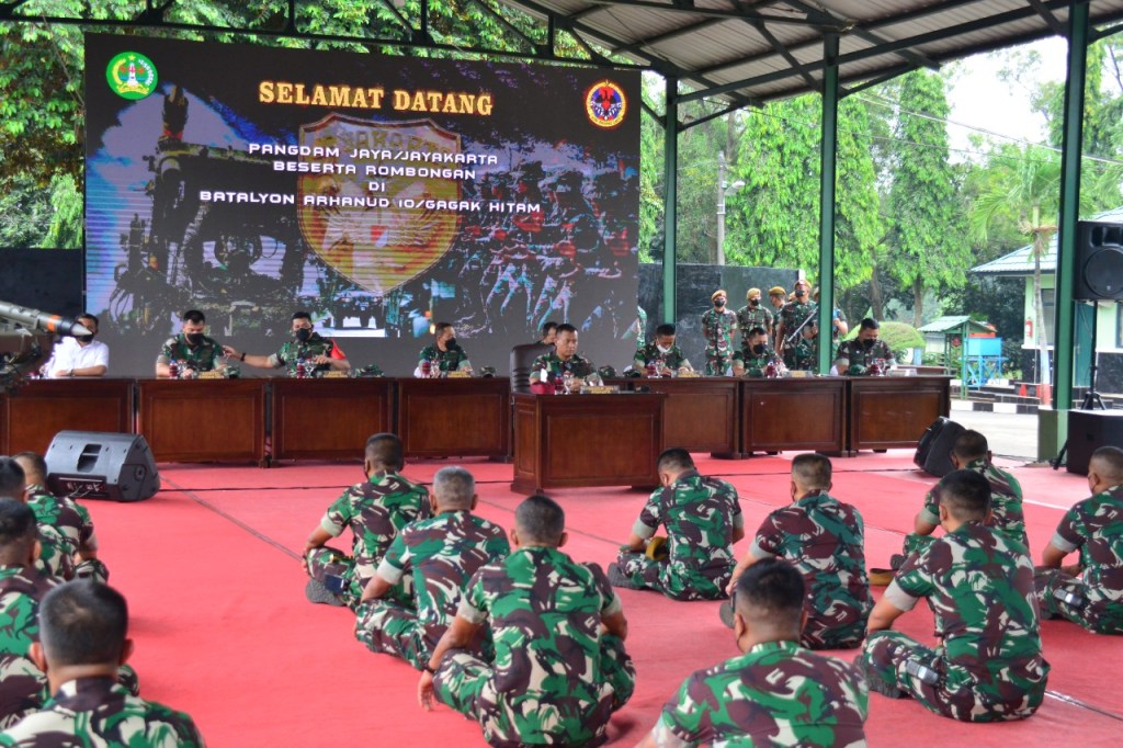 Pangdam Jaya/Jayakarta menerima jajar kehormatan dari jaga kesatrian serta pengalungan selendang batik dan buket bunga oleh dua orang anak kecil menggunakan baju adat betawi, tarian betawi dengan iringan musik dari Drum band Gagak Hitam turut memeriahkan penyambutan kedatangan Pangdam Jaya/Jayakarta, dilanjutkan dengan paparan Binsat Satuan oleh Danyon Arhanud 10/Gagak Hitam Letkol Arh Syarief SB, S.H, M.I.P., kepada Pangdam Jaya/Jayakarta.