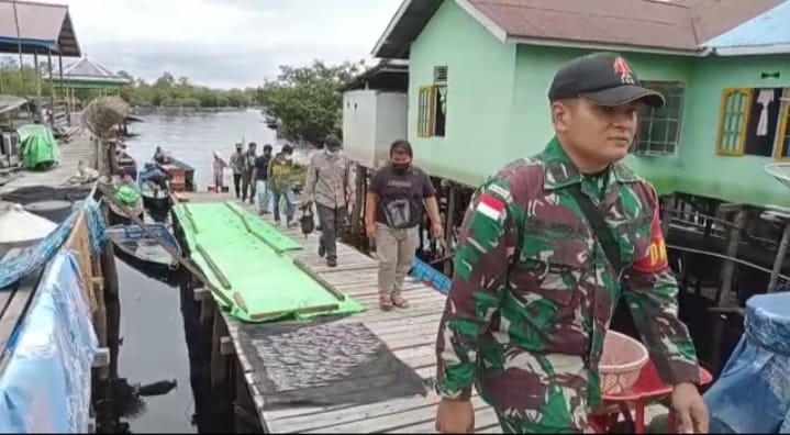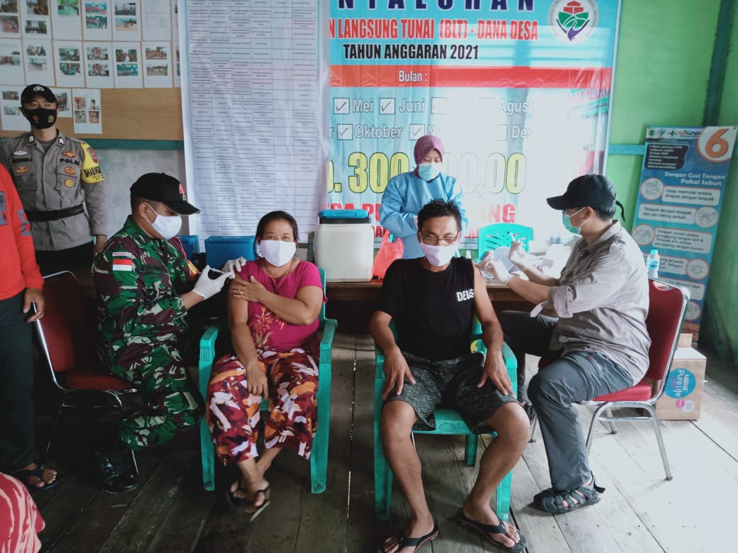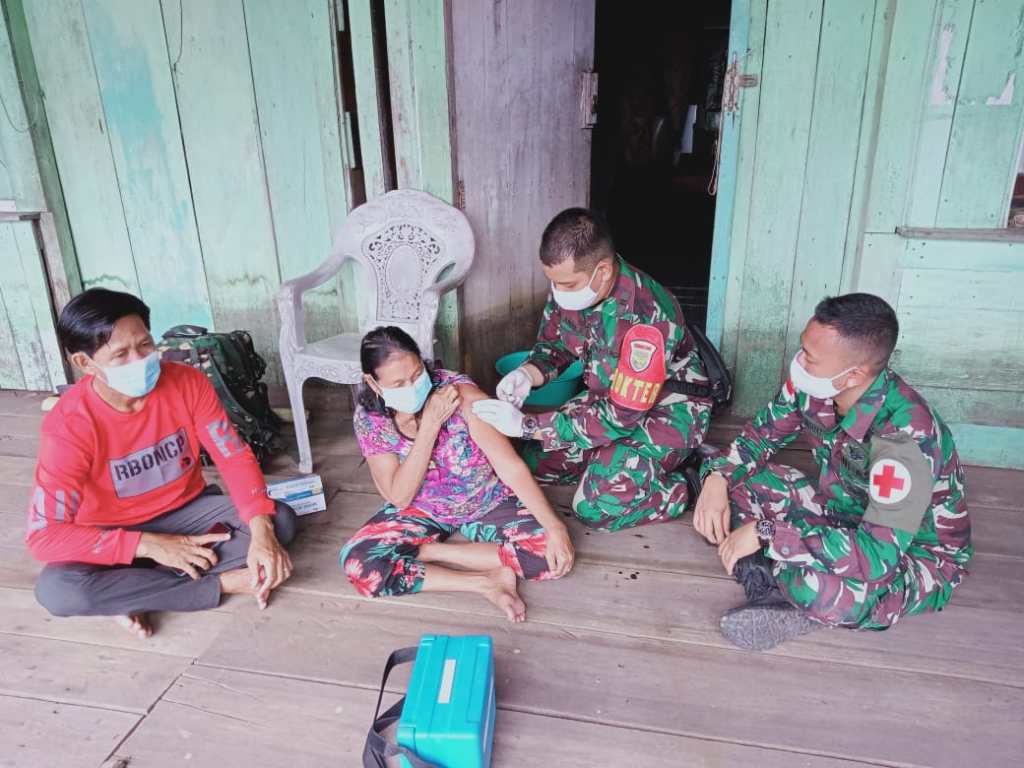 Anggota Satgas Yonif 144/JY bersinergi dalam percepatan penanganan Vaksinasi Covid-19 di Pulau majang Kecamatan Badau Kabupaten Kapuas Hulu Kalbar.