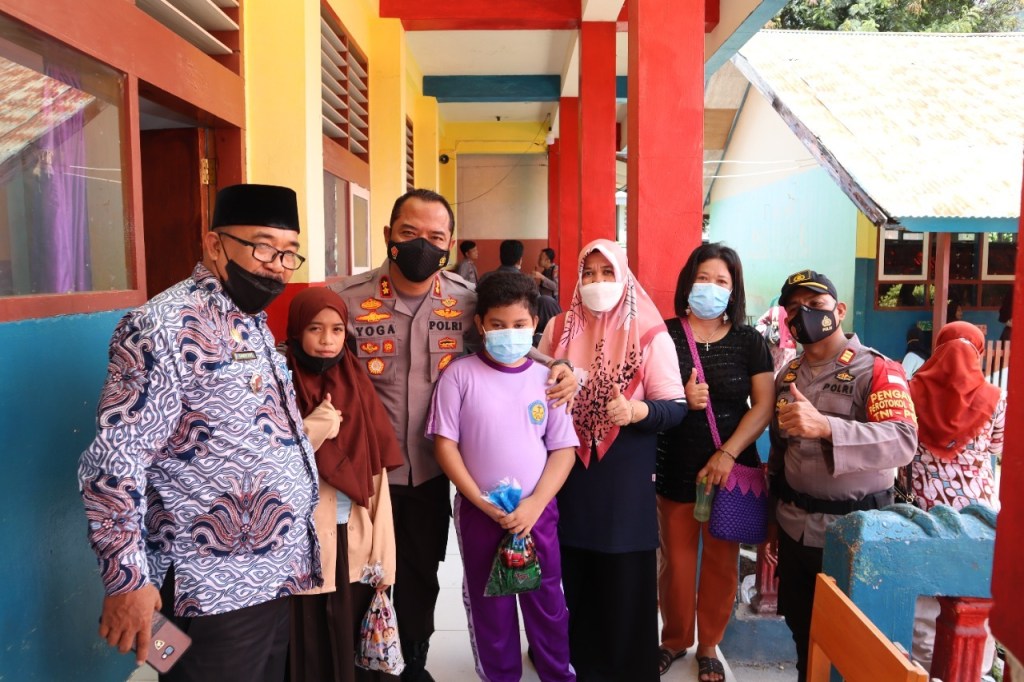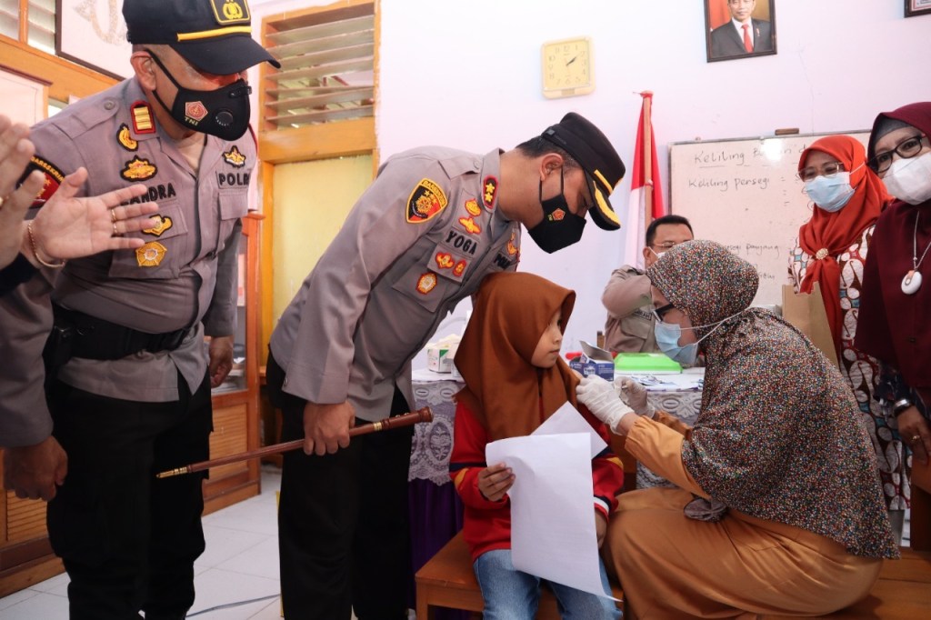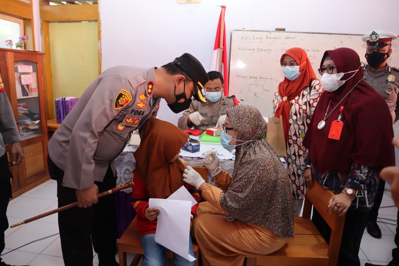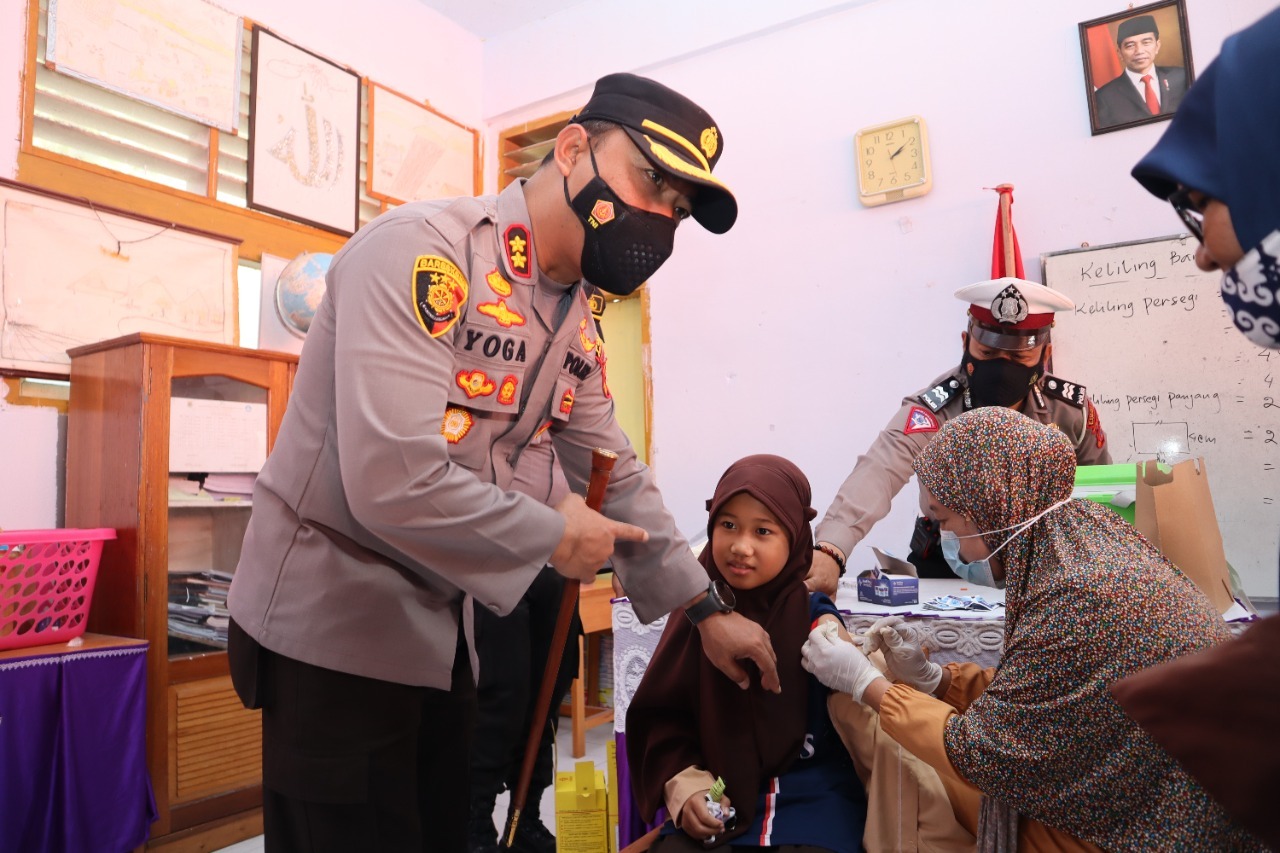 Kapolres Banggai AKBP Yoga Priyahutama SH, SIK, MH, menatau langsung proses vaksinasi serentak kepada anak usia 6-11 tahun di Sekolah Dasar Negeri (SDN) 7, Kelurahan Soho, Kecamatan Luwuk, Kabupaten Banggai, Kamis (27/1/2022).