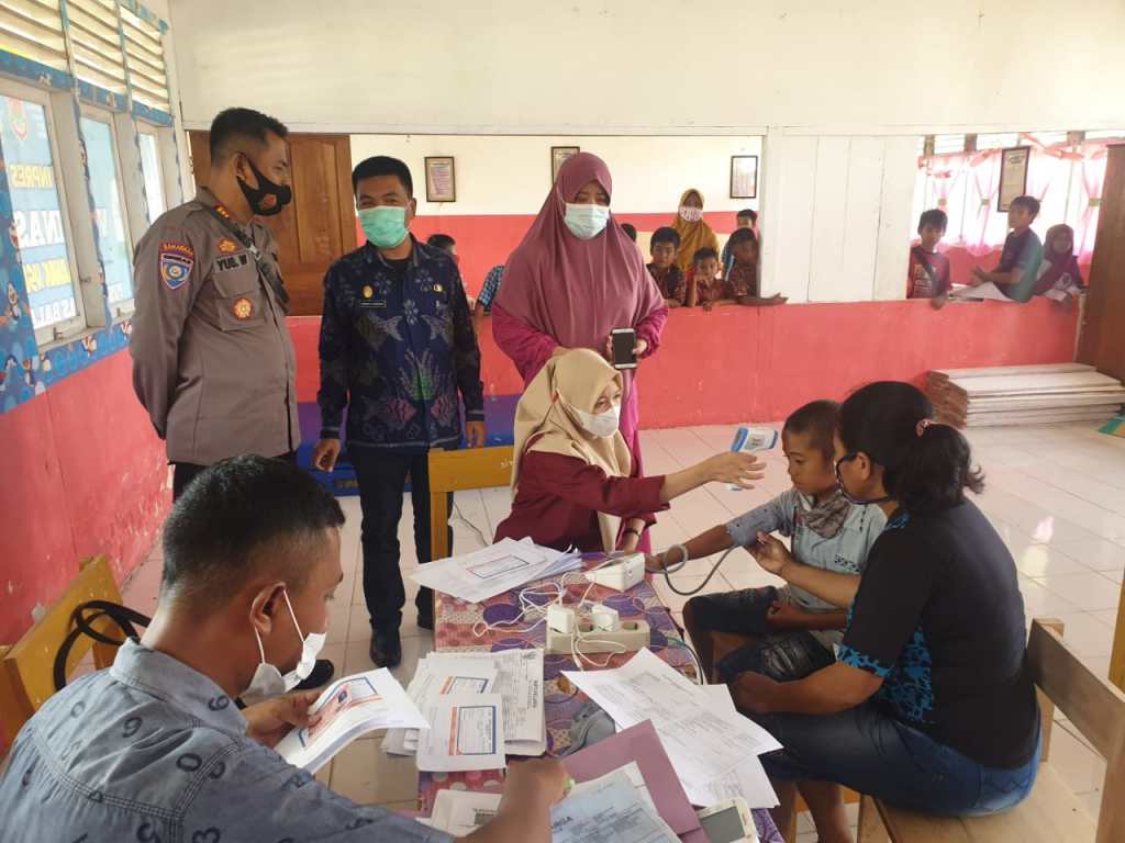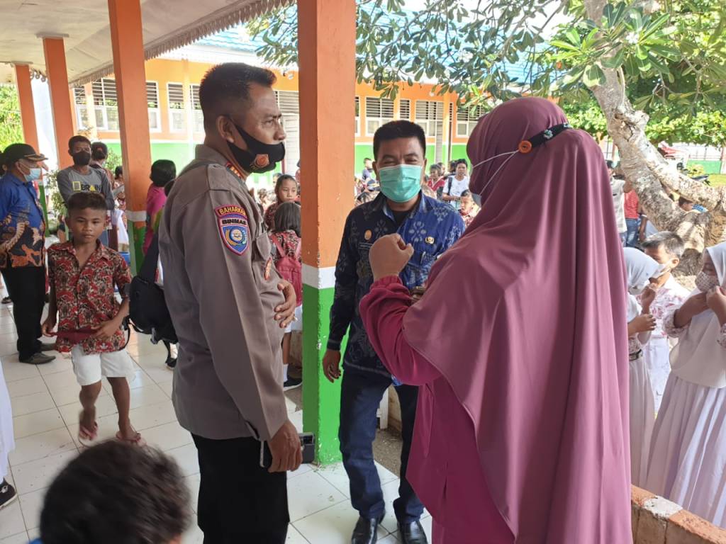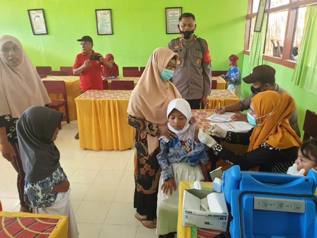 Kasat Binmas Polres Banggai AKP Yuswanto SH, memantau langsung kegiatan Vaksinasi Covid-19 bagi anak-anak usia 6-11 tahun di Sekolah Dasar Negeri (SDN) 2 Desa Mamping, Kecamatan Balantak Selatan dan SDN 1 Tongke, Kecamatan Balantak Selatan, Kabupaten Banggai, Kamis (27/1/2022).