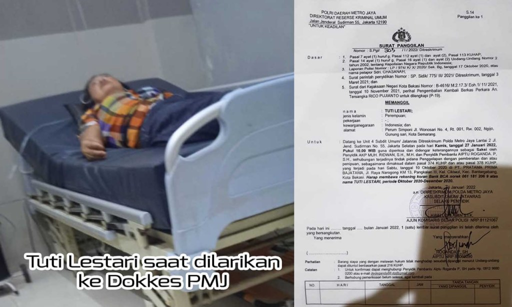 “Pak, ini istri saya habis diperiksa tumbang. Jantungnya sakit. Karena shock tadi (dia) teriak-teriak di dalam (depan penyidik Polda Metro Jaya). Sekarang kami mau dibawa ke RS AL Mintoharjo. Mau dibawa ambulance. Kami tidak ada biaya. Masih di Dokkes (Polda Metro Jaya),” demikian pesan WhatsApp beruntun yang masuk ke nomor kontak Ketua Umum Persatuan Pewarta Warga Indonesia (Ketum PPWI), Wilson Lalengke, dari Alex, suami Tuti Lestari, pada pukul 13.11 WIB.
