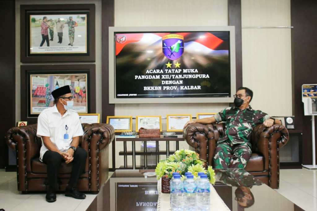 Bahas kerjasama dalam penanganan Stunting di Kalimantan Barat, Panglima Kodam XII/Tanjungpura Mayjen TNI Sulaiman Agusto, S.I.P., M.M., menerima kunjungan Kepala Perwakilan Badan Kependudukan dan Keluarga Berencana Nasional (Kaper BKKBN) Provinsi Kalbar, bertempat di Ruang Koridor Gedung A Makodam XII/Tpr.