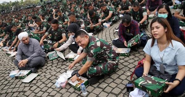 Setelah ikut bernyanyi dan bertepuk tangan dari satu barisan pasukan ke barisan lainnya, Dudung kemudian meminta pasukan untuk berhenti dan mulai menyantap makan.