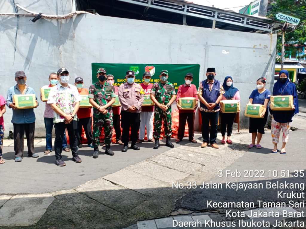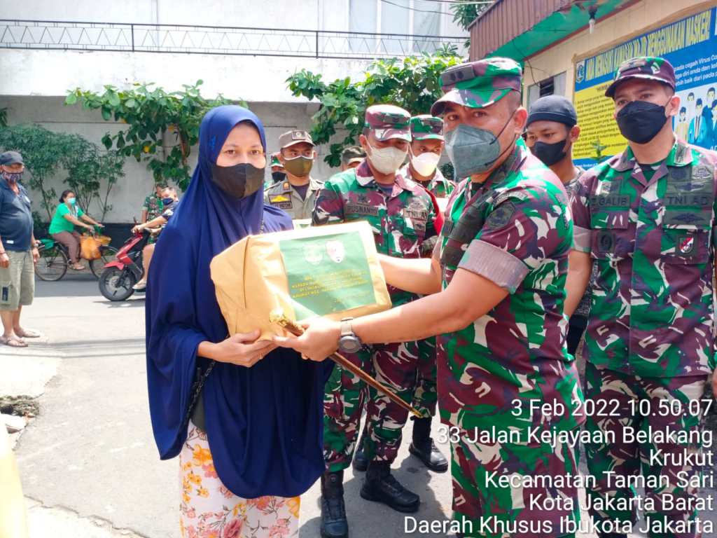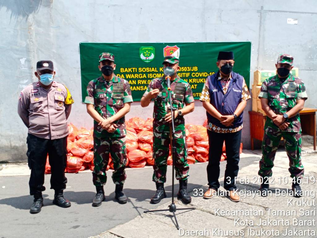 Komandan Kodim (Dandim) 0503/JB, Letkol Kav I Made Maha Yudhiksa.S.sos.MM yang di dampingi Danramil 01/Tamansari, Mayor Inf Zulkarnaen Galib membagikan paket sembako kepada warga yang Isoman di lingkungan Rw. 02, Kel. Krukut, Kec. Tamansari.
