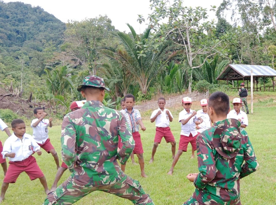 Personel Satgas Pamtas RI-PNG Yonif 126/KC melatih beladiri Karate kepada anak-anak sekolah di Perbatasan Papua (Foto-red)