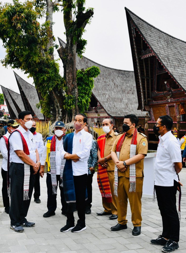 Pangdam I/BB Mayjen TNI Hassanudin, SIP, MM, bersama Kapoldasu Irjen Pol Panca Putra Simanjuntak mendampingi Presiden Jokowi Resmikan Penataan Huta Siallagan, Rabu (2/2/2022) sore.