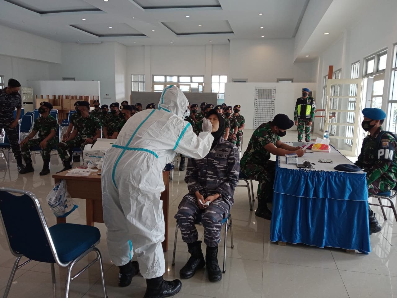Dari lapangan apel, seluruh prajurit Lanal Palu diarahkan menuju gedung Serbaguna untuk mendaftar Swab Antigen. Menurut Komandan Lanal Palu Kolonel Marinir Marthin Luther Ginting, M. Tr. Hanla Swab Antigen massal kepada seluruh prajurit Lanal Palu merupakan pencegahan dan deteksi dini juga tindakan preventif terhadap penyebaran Covid-19 varian baru yang muncul baru baru ini.