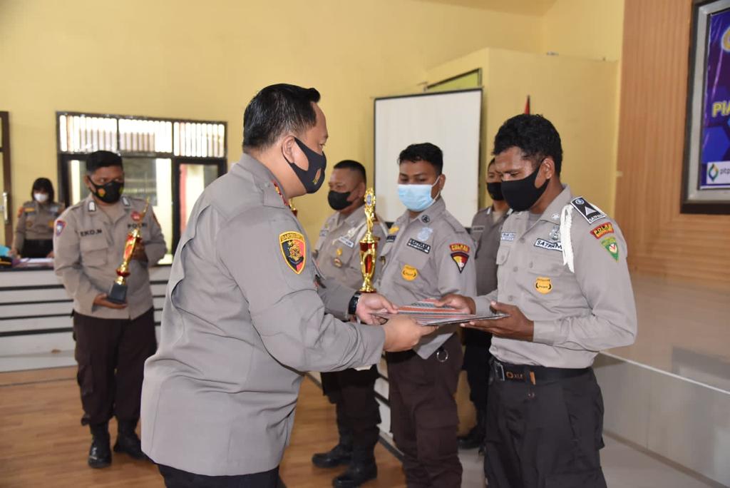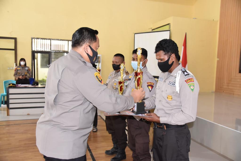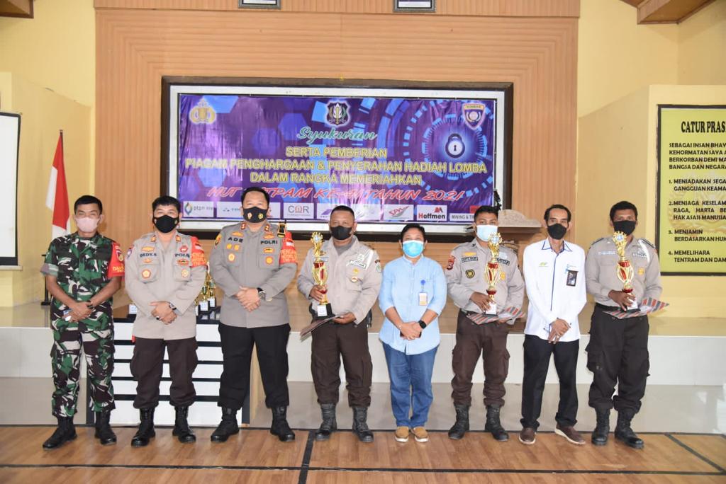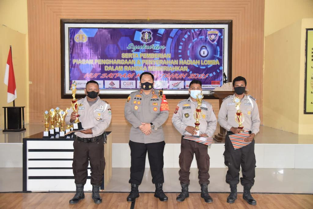 Usai memberikan sambutannya Kapolres Morowali Utara menyerahkan Piagam Penghargaan dan hadiah kepada para Satuan pengamanan yang berhasil menjadi juara lomba dalam rangka menyambut Hari Ulang Tahun Satpam ke 41.