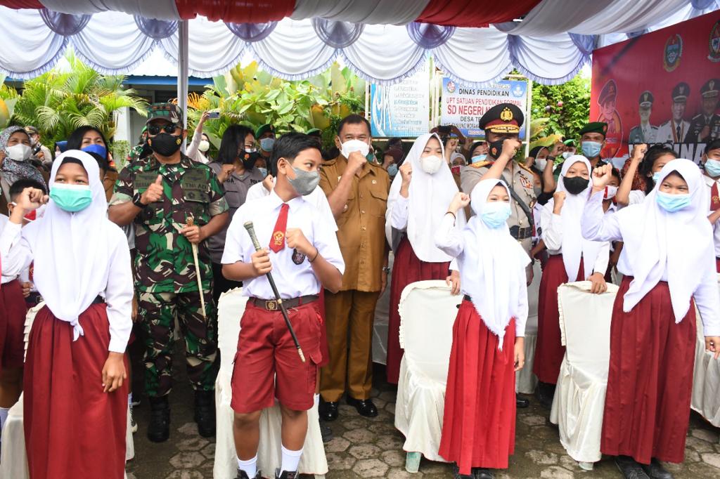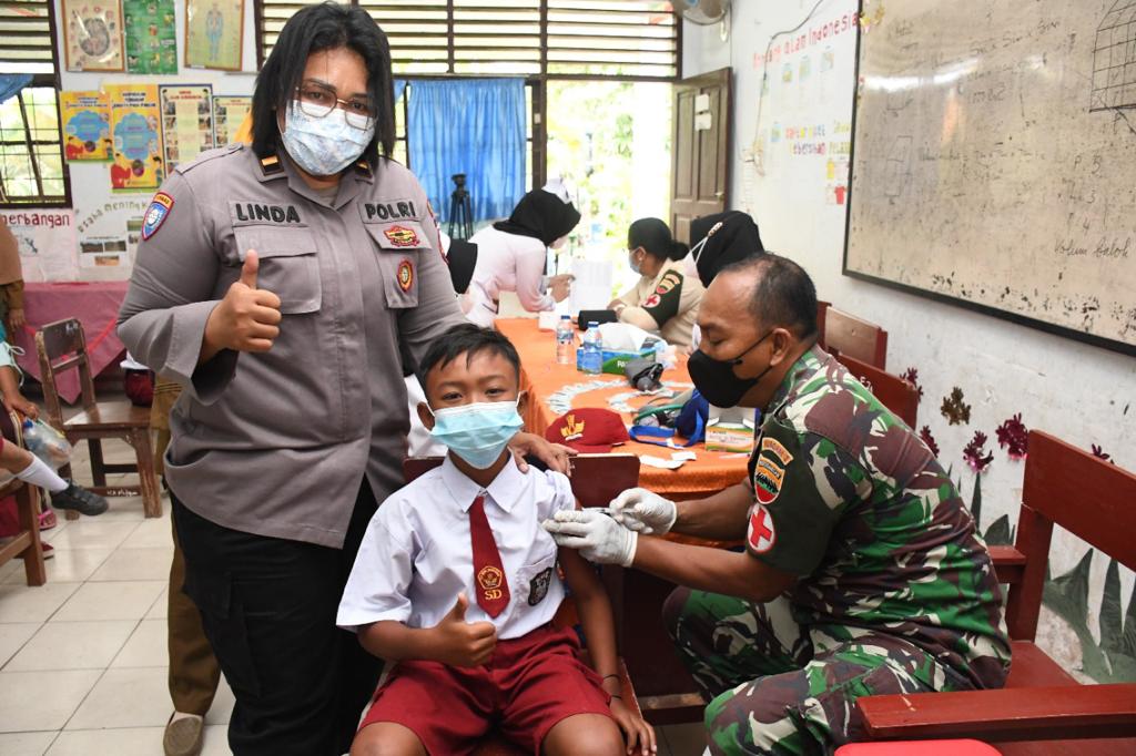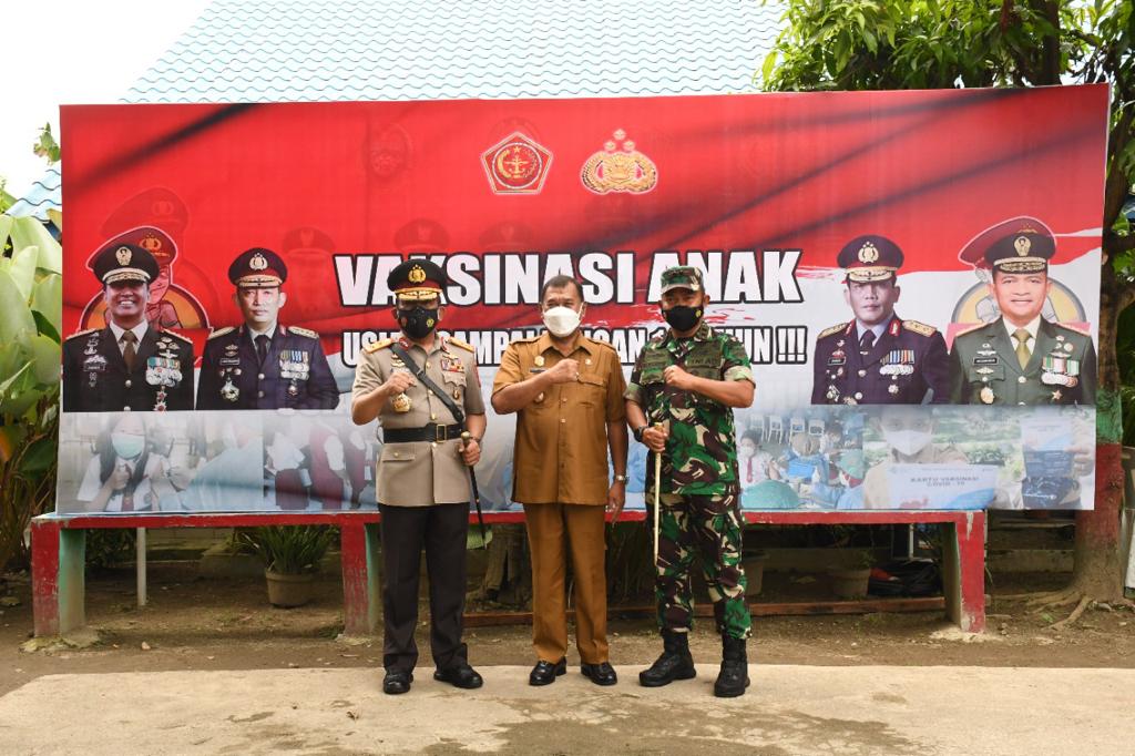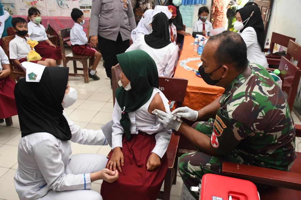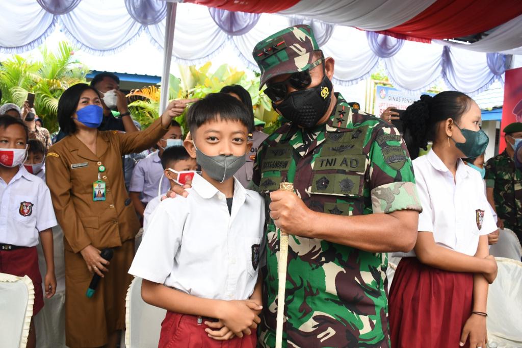 Pangdam I/BB, Mayjen TNI Hassanudin, SIP, MM, mengapresiasi pelaksanaan vaksinasi anak usia 6-11 tahun di SDN 104238 Telagasari, Kecamatan Tanjung Morawa, Kabupaten Deliserdang, Selasa (8/2/2022).