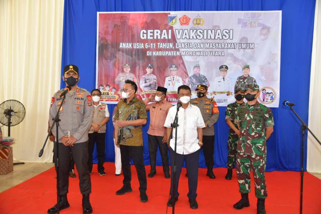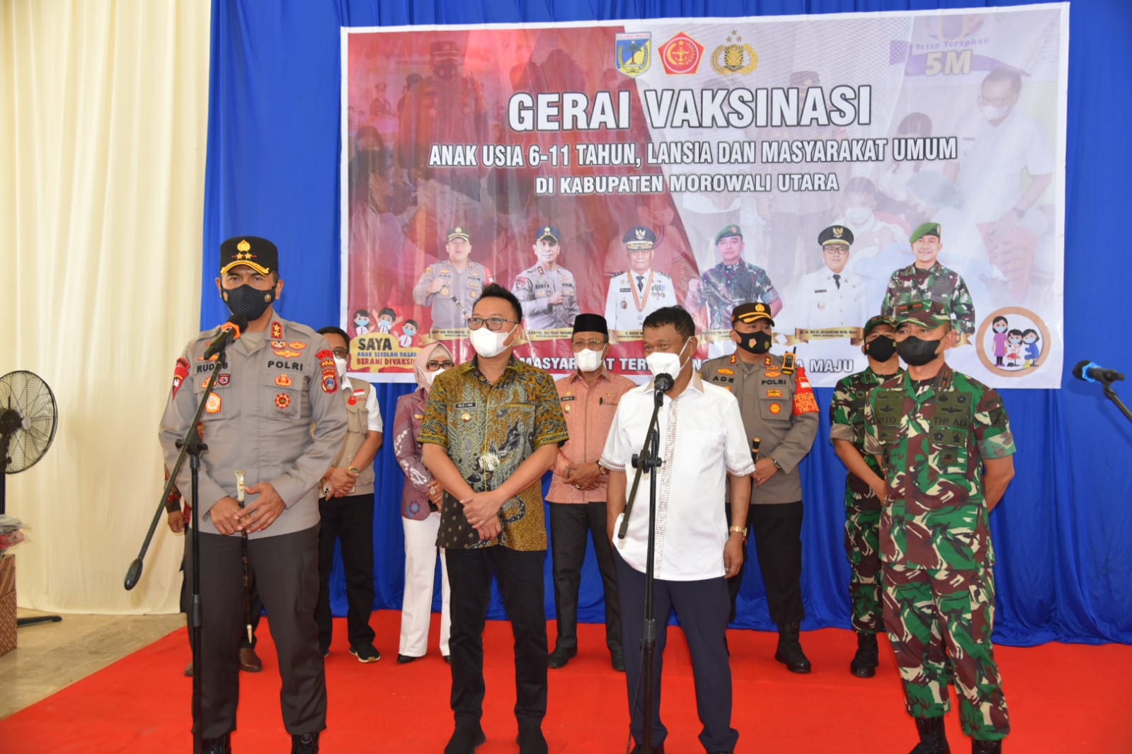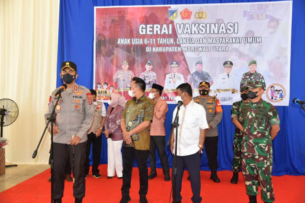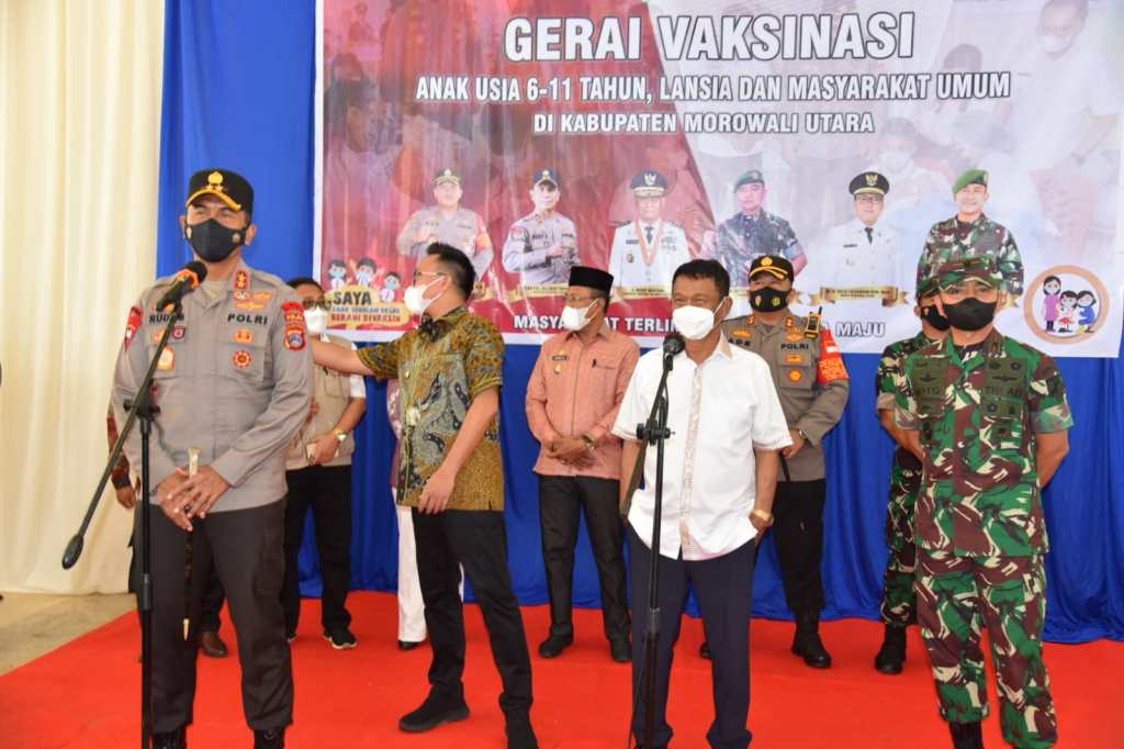Dengan didampingi oleh Bupati Morowali Utara, Ketua DPRD, Sekertaris Daerah Kabupaten Morowali Utara, Kapolres Morowali Utara dan Dandim 1311 Morowali, Kapolda Sulawesi Tengah memberikan apresiasi setinggi-tingginya kepada seluruh Forkopimda di Kabupaten Morowali Utara yang telah bekerja keras dalam mendukung program pemerintah terkait percepatan vaksinasi terutama vaksinasi terhadap anak usia 6-11 tahun dan para lansia.
