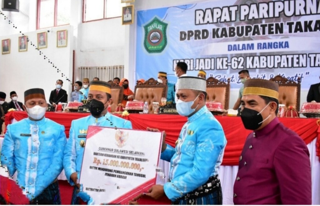 “Dimomen hari jadi ini, Pemerintah Provinsi Sulsel memberikan bantuan sebanyak 15 M untuk pembangunan tanggul di pesisir pantai di takalar dengan harapan tidak ada lagi warga pesisir yang terkena dampak abrasi, Saya meminta kepada Bupati, forkopimda untuk mengawal pembangunan ini sampai selesai demi keselamatan masyarakat.” Ujar Plt. Gubernur Sulsel.