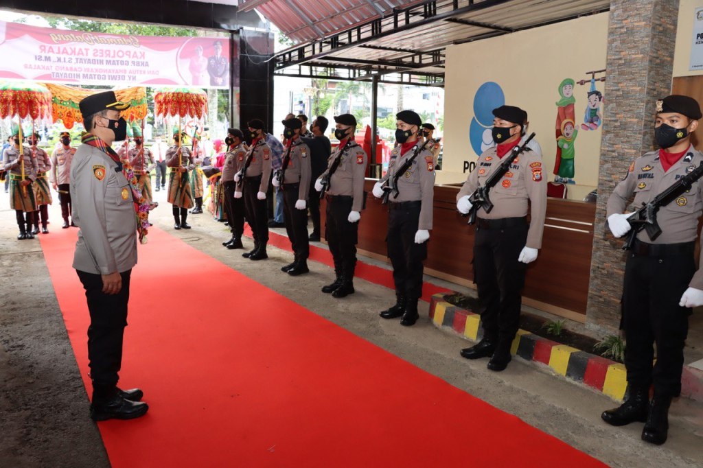 Kedatangan Kapolres Takalar yang baru AKBP Gotam Hidayat, S.I.K., M.Si disambut dengan acara Jajar Kehormatan dan pengalungan bunga.