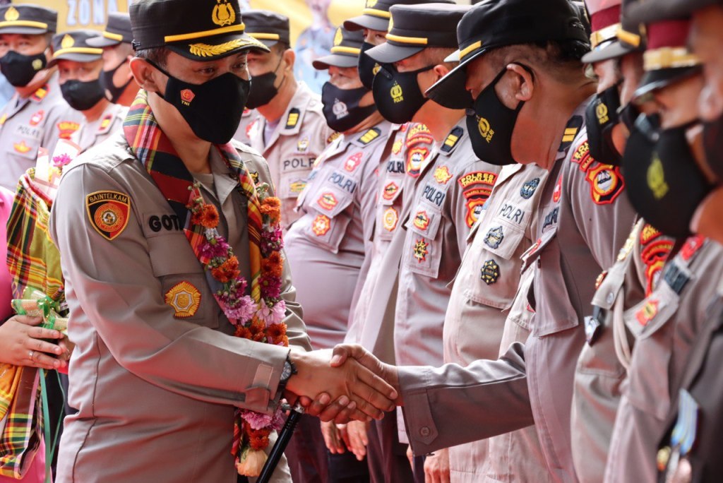 Personel Polres Takalar menyambut dengan penuh suka cita disertai jabatan tangan kepada Kapolres Takalar yang baru AKBP Gotam Hidayat, S.I.K.,M.Si.