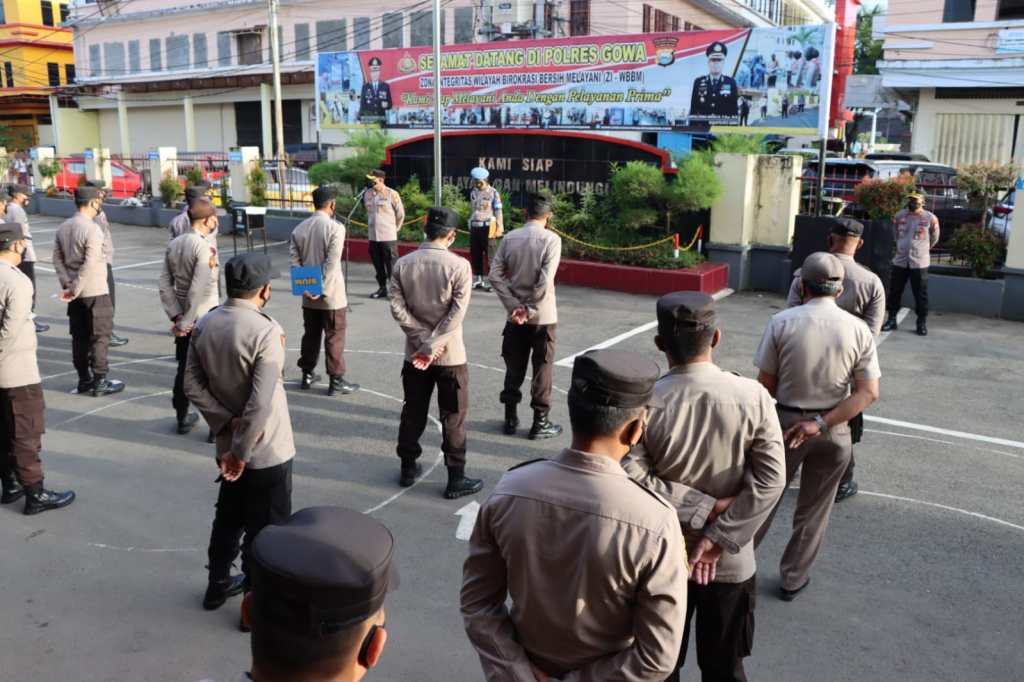 Kapolres Gowa AKBP Tri Goffarudin. P. SIK.,MH saat memimpin pelaksanaan apel pagi memberikan beberapa penekanan untuk ditindaklanjuti para personil.