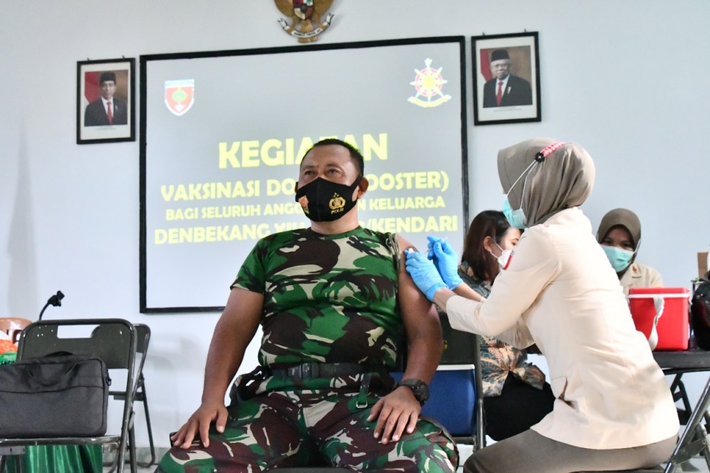 Dalam mendukung dan mensukseskan program pemerintah pusat Prajurit, PNS dan KBT Denbekang XIV-44-03/Kendari ikuti Vaksinasi Covid-19 Dosis ke 3 atau Booster.