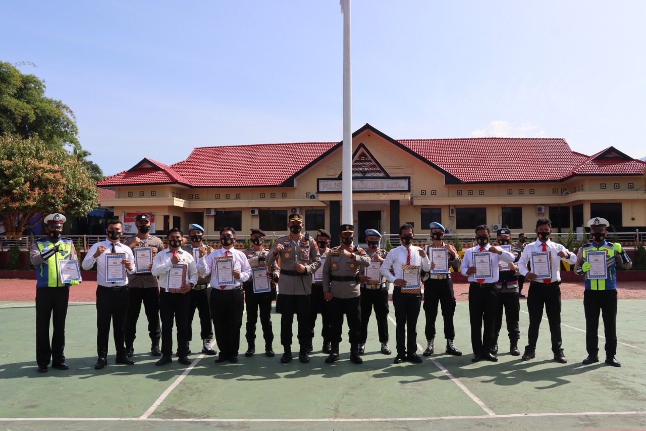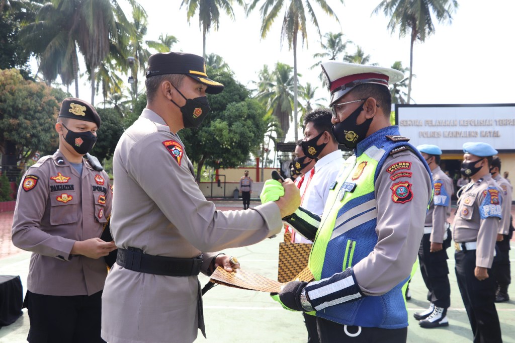 Kapolres Mandailing Natal AKBP H.M. Reza Chairul A.S, S.I.K, S.H, M.H memberikan reward kepada Kanit Kamsel Sat Lantas Polres Madina Aipda Indra pada hari Senin tanggal 21 Febuari 2022 di Halaman Apel Mako Polres Madina.