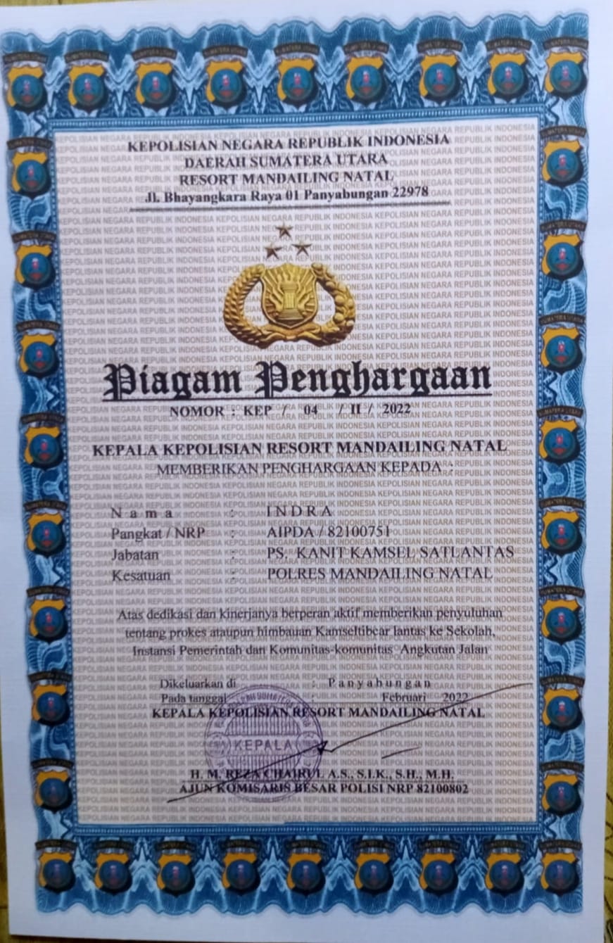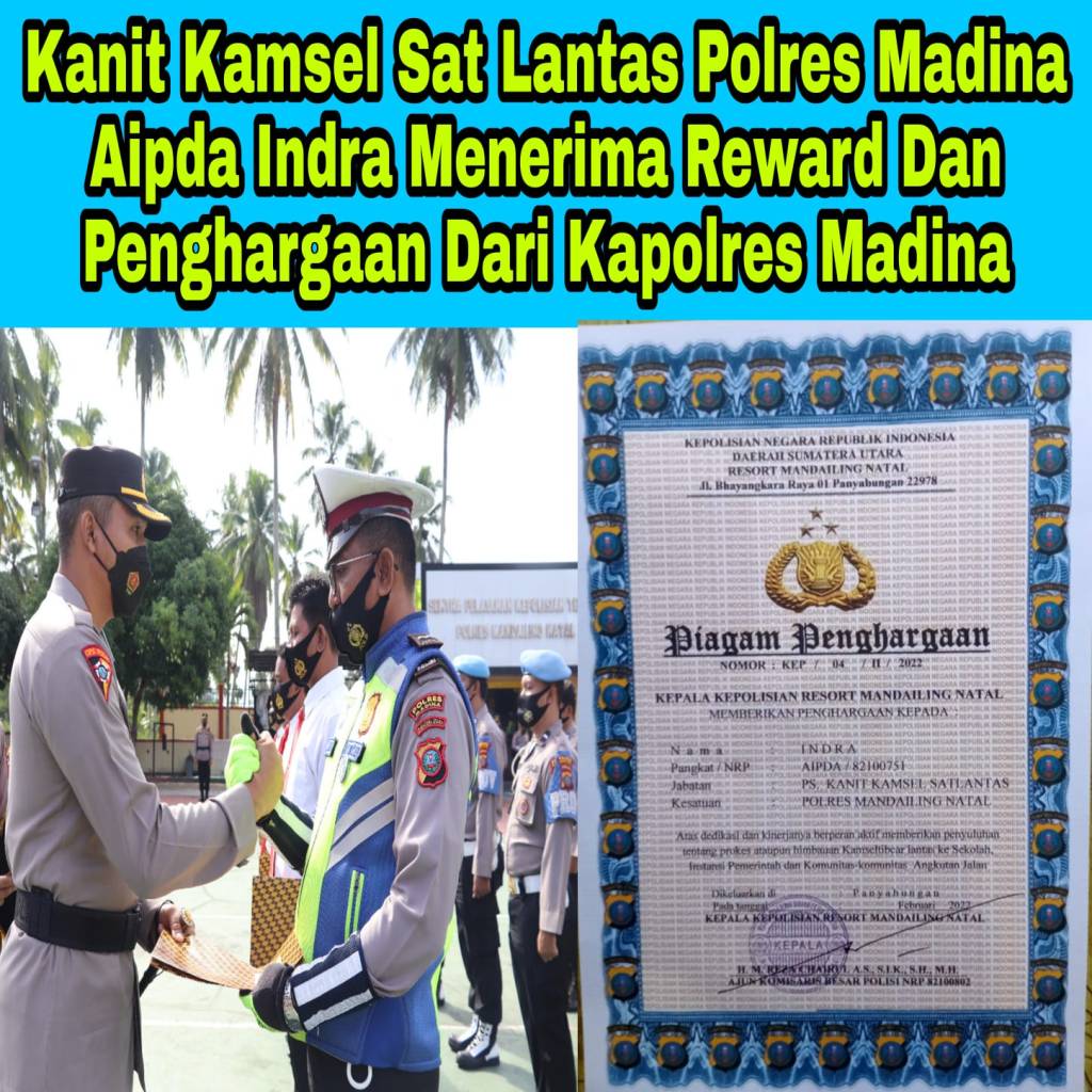 “Reward ini saya berikan kepada Aipda Indra dengan kriteria memiliki dedikasi dan kinerja yang berperan aktif memberikan penyuluhan tentang Prokes Covid-19 ataupun Kamseltibcarlantas ke sekolah dan instansi pemerintah serta komunitas angkutan jalan” Papar Kapolres Madina.