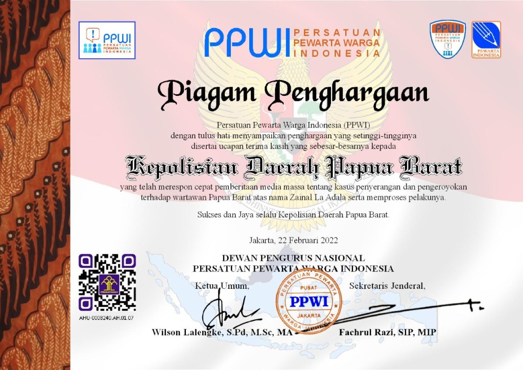 PPWI merespon kerja baik yang telah dilakukan Penyidik Polda Papua Barat dengan menganugerahkan Piagam Penghargaan kepada institusi Polri di Provinsi Papua Barat yang digawangi Irjen Pol Tornagogo Sihombing, SIK, M.Si itu. “PPWI dengan tulus hati memberikan penghargaan yang setinggi-tingginya disertai ucapan terima kasih yang sebesar-besarnya kepada Kepolisian Daerah Papua Barat. Sukses dan Jaya selalu Kepolisian Daerah Papua Barat,” demkian tulisan yang terbaca pada Piagam Penghargaan PPWI dimaksud.