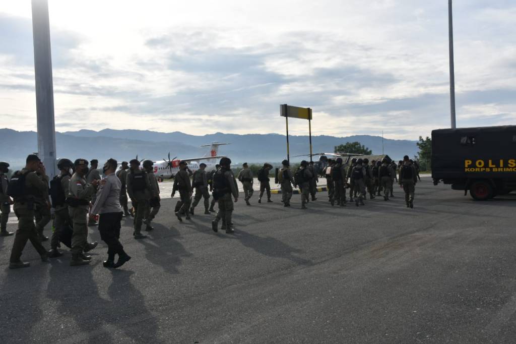 Pagi ini menggunakan pesawat komersial Lion Air, 315 personil Brimob Nusantara telah tiba di Bandara Mutiara Sis Aljufri Palu, Kamis (24/2/2022)