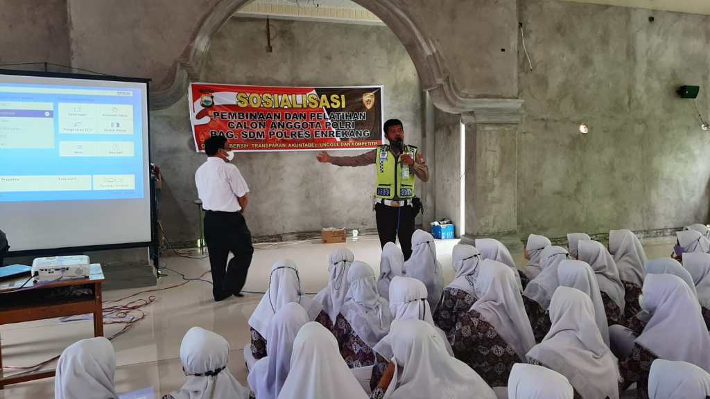 Satuan Lalu Lintas Polres Enrekang melaksanakan sosialisasi Tertib Berlalu Lintas kepada Siswa/siswi SMA Negeri 2 Enrekang disela sosialisasi pembinaan dan pelatihanan calon anggota polri Bagian SDM Polres Enrekang, di Gedung Pertemuan SMA Negeri 2 Enrekang, Kamis (24/02/2022).
