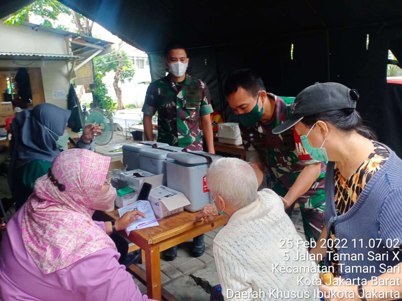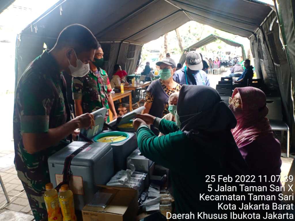 Kodim 0503/JB Koramil 01/TS – Hari kedua Tenaga Kesehatan (Nakes) Kesdam Jaya berkolaborasi dengan Puskesmas Tamansari melayani masyarakat yang ingin vaksin di serbuan vaksinasi