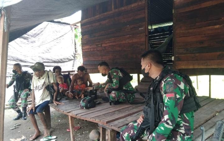 Dalam kegiatannya, anggota Pos Arso Kota berbincang-bincang dan memberikan masukkan kepada Bapak Eki (36), salah satu warga serta berbincang mengenai perkembangan situasi di Perbatasan Papua.