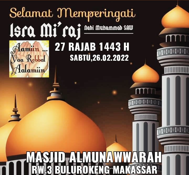 Dibulan Rajab peristiwa ISRA MI’RAJ RASULULLAH SALLALLAHU ALAIHI WASALLAM, 27 Rajab tahun 2022 hari Senin, 28 Februari 2022, diperingati oleh Pengurus Remaja Masjid Almunawwarah RW.3 Kel.Bulurokeng Kec.Biringkanaya Kota Makassar, bersama Majelis Taklim Imadinah pada Sabtu, 26/02/2022 pkl 20.00 Wita.
