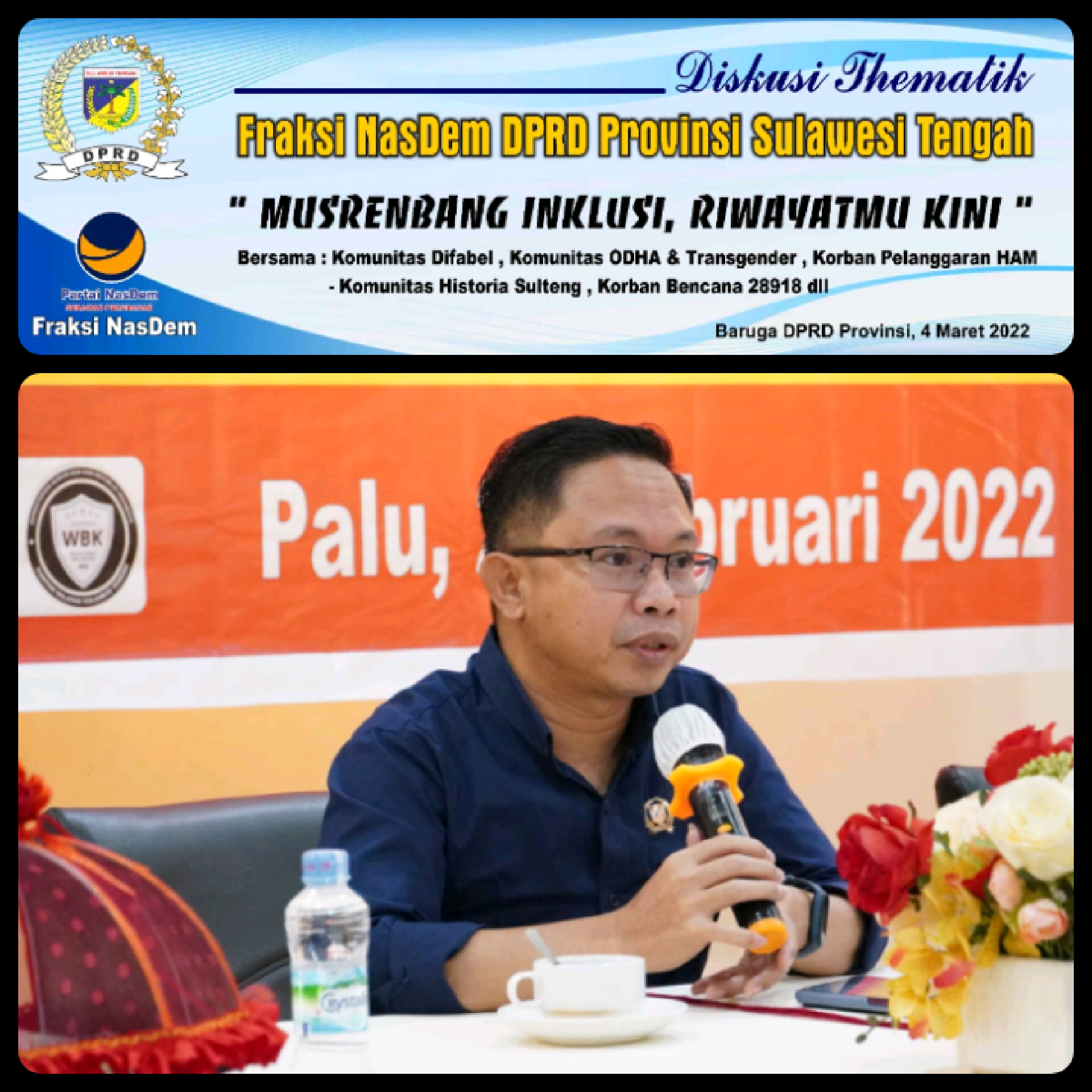 Diskusi Thematik “Musrenbang Inklusi, Riwayatmu Kini” akan digelar pada malam hari ini, pkl. 19.30 WITA di Gedung Baruga DPRD Provinsi Sulawesi Tengah, dan akan di hadiri oleh Ketua fans Anggota Fraksi NasDem DPRD Provinsi serta dibuka secara virtual oleh Ibu Dr. Hj. Nilam Sari Lawira., SP., MP., selaku Ketua DPRD.