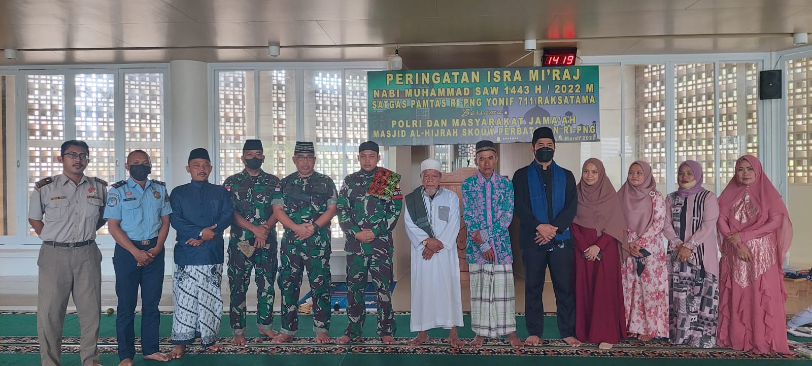 Satgas Pamtas RI-PNG Yonif 711/Rks menggelar peringatan Isra Mi’raj Nabi Muhammad SAW 1443/2022 M bertempat di Mesjid Al-Hijrah Kel. Skouw Sae, Kec. Muara Tami, Kota Jayapura, Sabtu (05/03/2022).