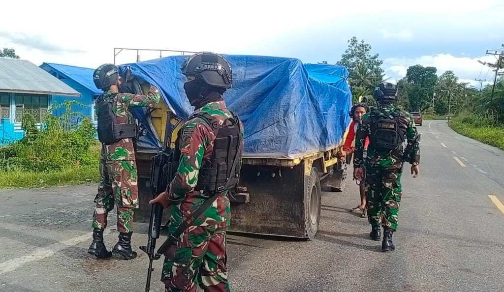 Personel Satgas Pamtas RI-PNG Yonif 711/Rks melaksanakan sweeping di jalan lintas Desa Arso Kota, Kecamatan Arso, Kabupaten Keerom. Papua
