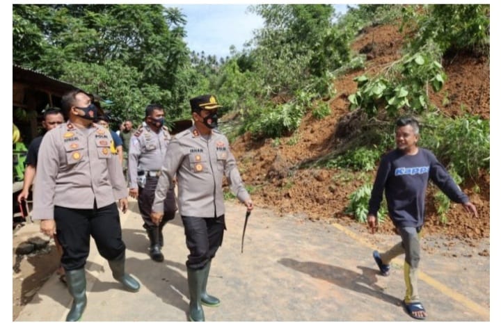 Kapolres Kotamobagu AKBP Irham Halid, SIK bersama personil jajaran gerak cepat membantu proses evakuasi material longsor serta pengaturan dan pengalihan arus lalu lintas.