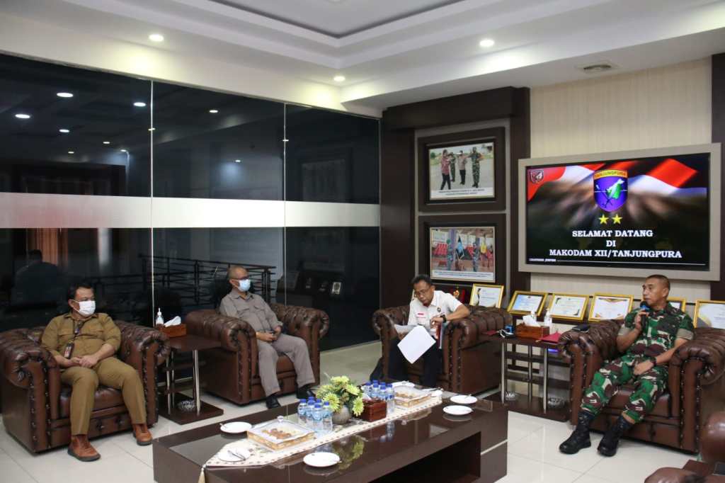 Panglima Kodam XII/Tanjungpura, Mayjen TNI Sulaiman Agusto, S.I.P., M.M., yang diwakili oleh Kapoksahli Pangdam XII/Tpr, Brigjen TNI Handoko Nurseta, S.H, M.Tr (Han) menerima kunjungan Tim dari Kementerian Koordinator Bidang Politik, Hukum dan Keamanan Republik Indonesia bertempat di ruang koridor gedung A Makodam XII/Tpr.