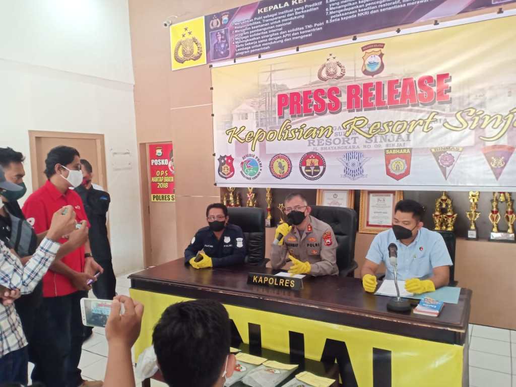 Kepala Kepolisian Resor Sinjai, Ajun Komisaris Besar Polisi (Akbp) Rachmat Sumekar, S.Ik., M.Si didampingi Kasat Reskim Akp Abustam, SH.,MH dan Kasi Humas Akp Fatahuddin B,SH pimpin Press Release pengungkapan kasus penganiayaan menyebabkan orang Meninggal Dunia. Selasa (8/3/2022).