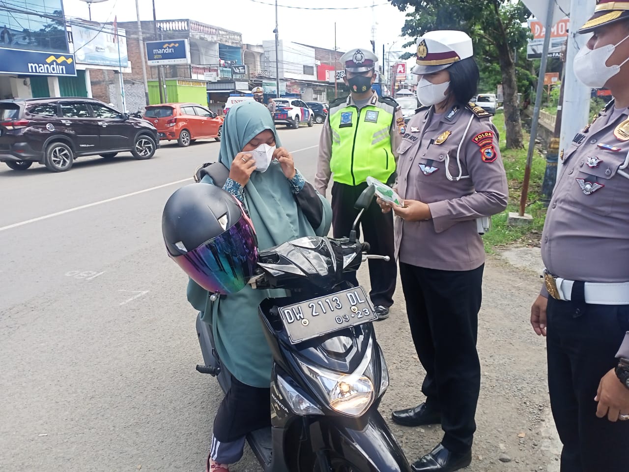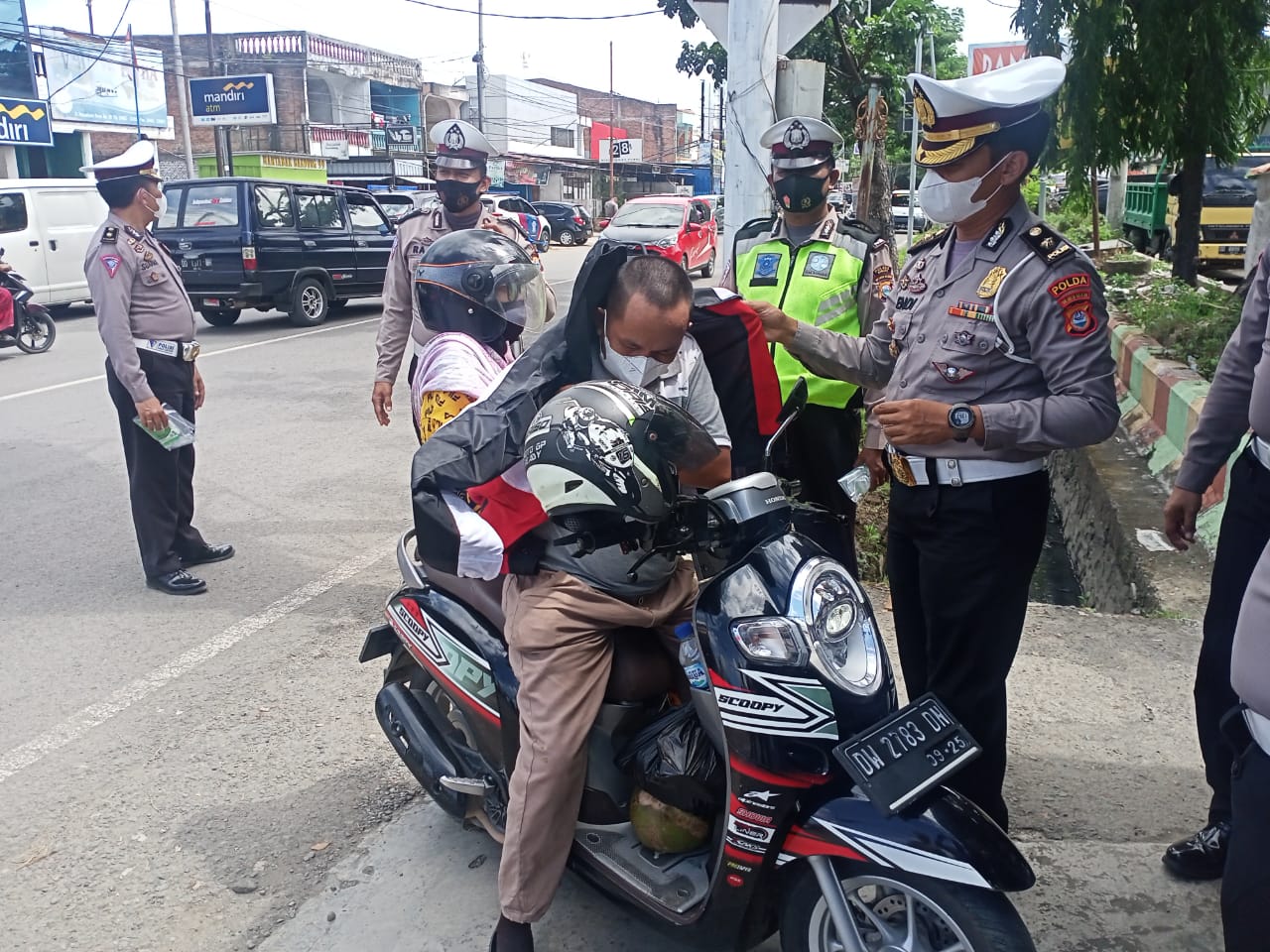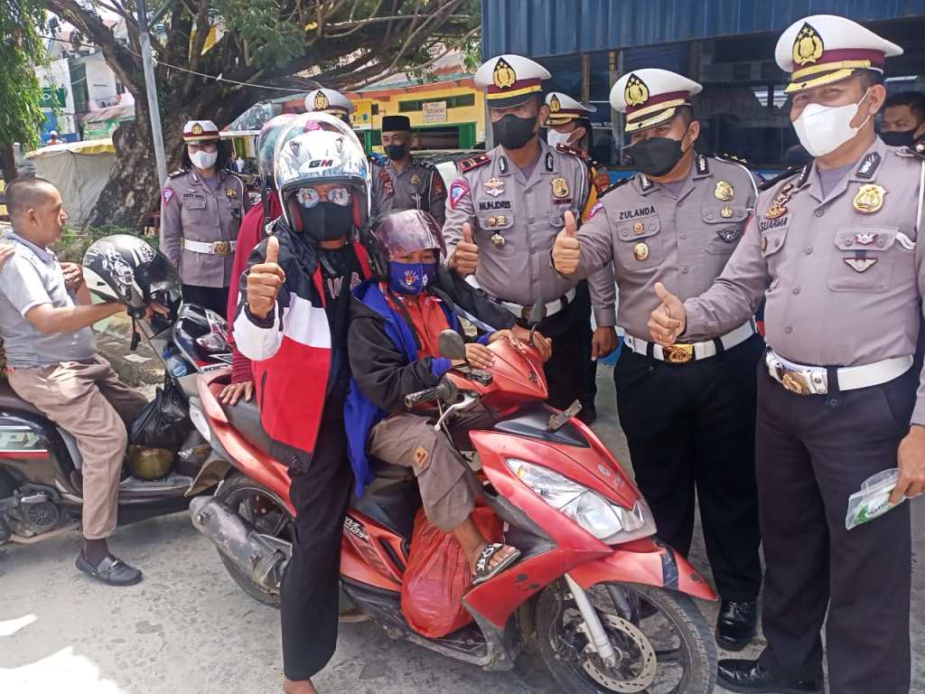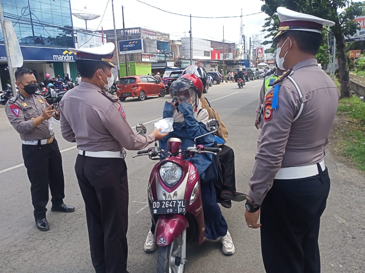 Tim Direktorat Lantas Polda Sulsel dipimpin oleh Akbp Zulanda S.I.K beserta anggotanya menyapa kepada pengendara bermotor yang sementara melintas di jalan dan membagikan masker, jaket dan helm kepada pengendara sekaligus memberikan imbauan tertib berlalu lintas dan patuhi protokol kesehatan.
