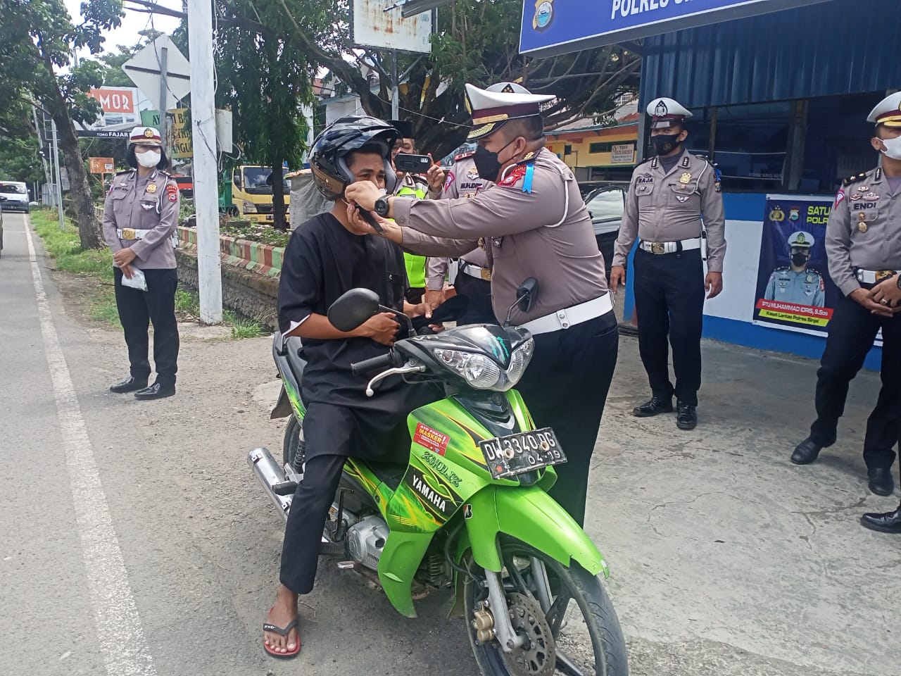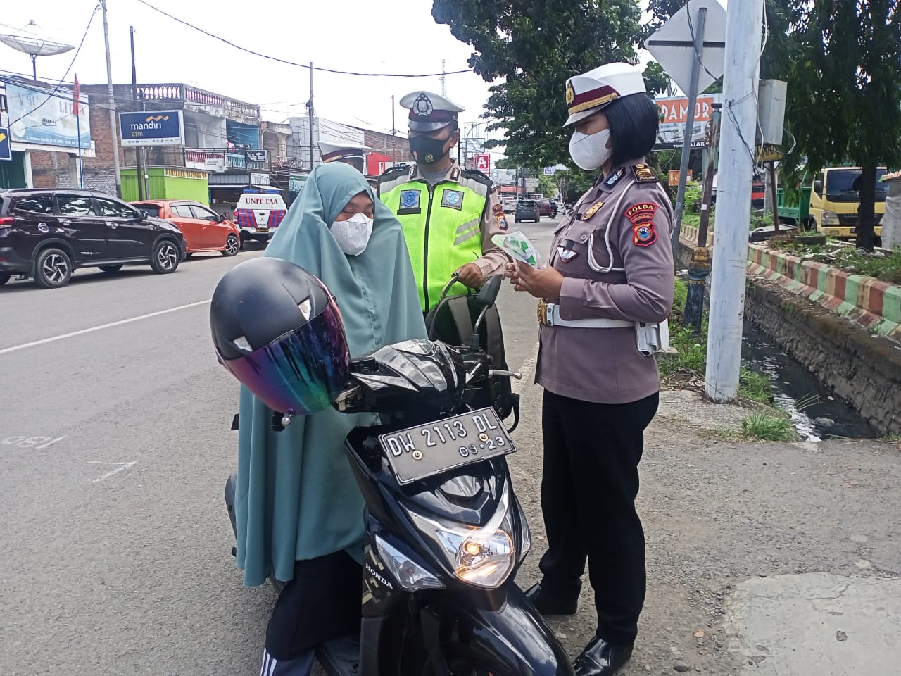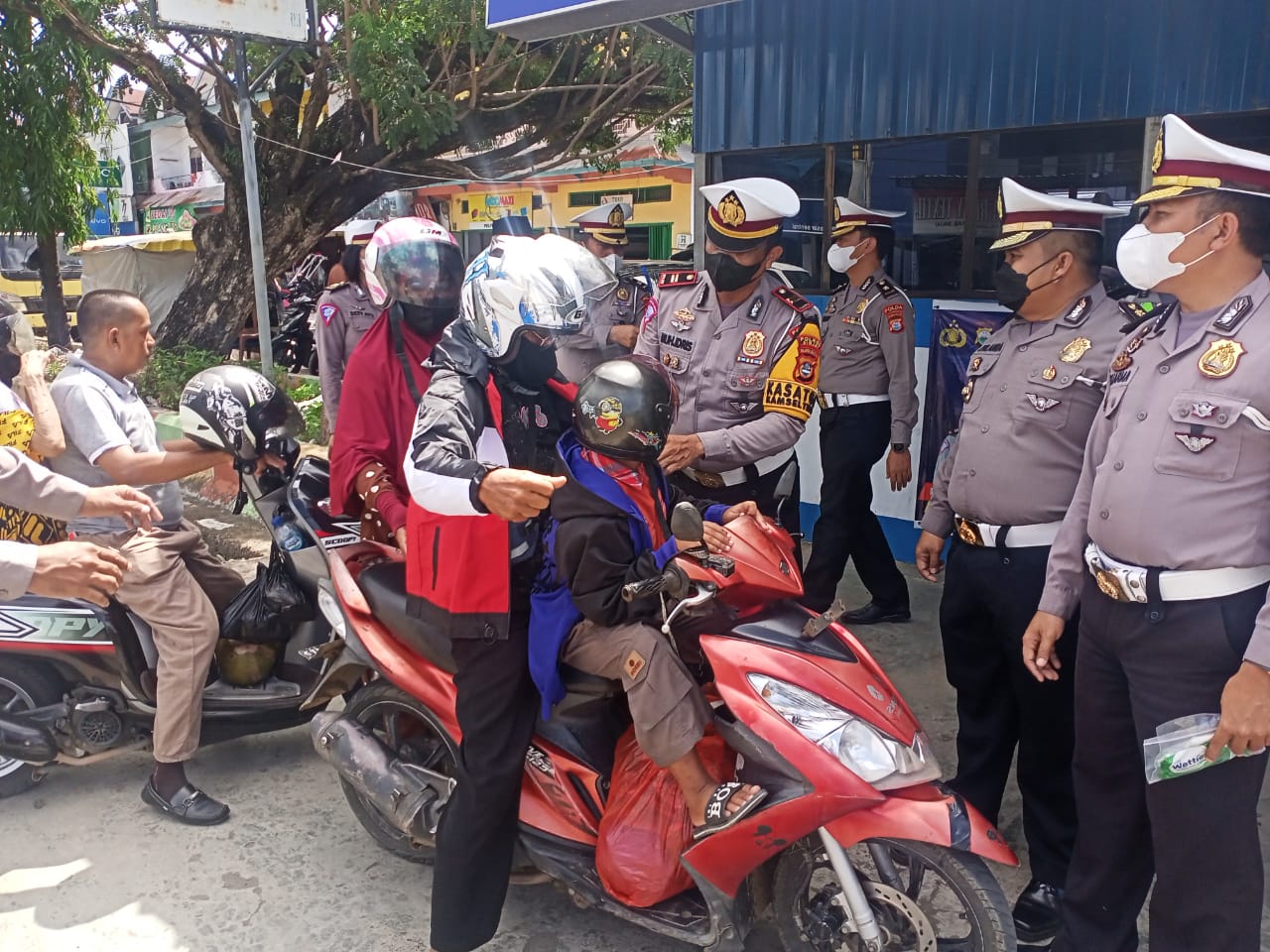 Tim Direktorat Lantas Polda Sulsel dipimpin oleh Akbp Zulanda S.I.K beserta anggotanya menyapa kepada pengendara bermotor yang sementara melintas di jalan dan membagikan masker, jaket dan helm kepada pengendara sekaligus memberikan imbauan tertib berlalu lintas dan patuhi protokol kesehatan.