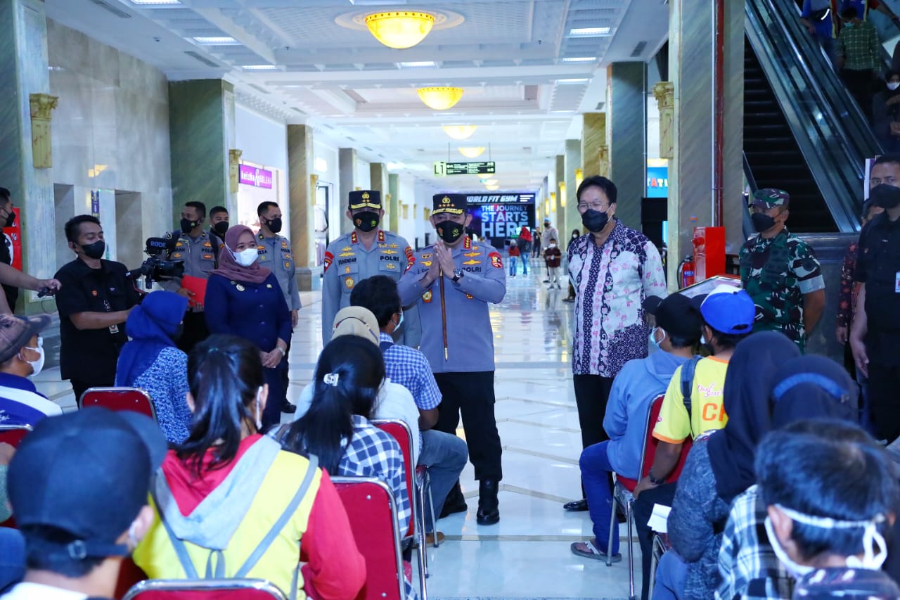 Kapolri Jenderal Listyo Sigit Prabowo meninjau pelaksanaan percepatan akselerasi vaksinasi serentak di 5.214 titik 34 Provinsi Indonesia. Dalam kesempatan ini, Sigit menghadiri secara langsung kegiatan tersebut di Sleman City Hall, Kabupaten Sleman, DIY.