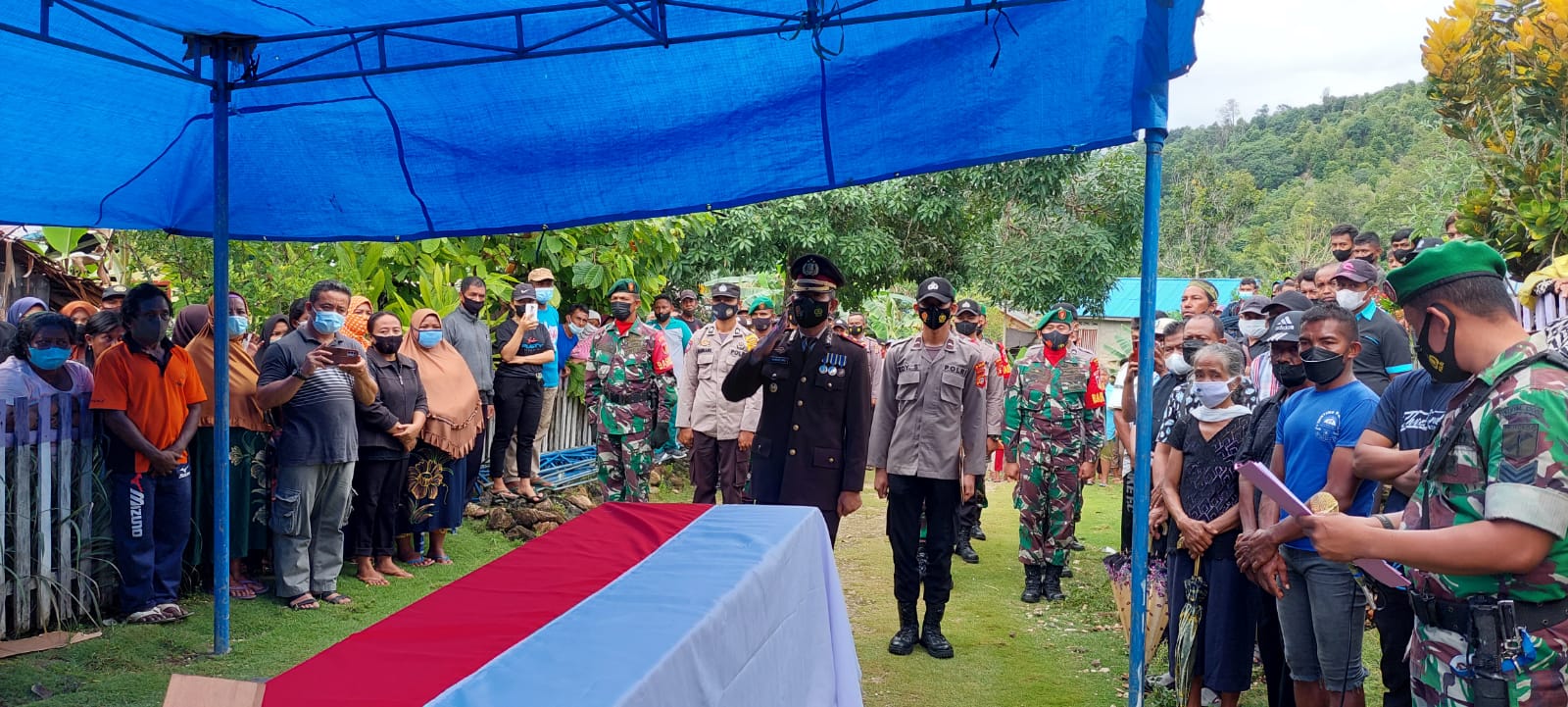 Usai pelaksanaan ibadah, dilanjutkan upacara penyerahan Jenazah dari pihak keluarga kepada pihak TNI Polri yang diterima oleh Waka Polres Bangkep untuk dimakamkan secara militer.