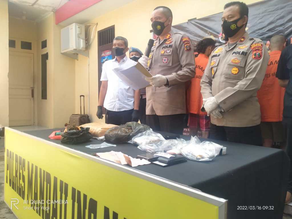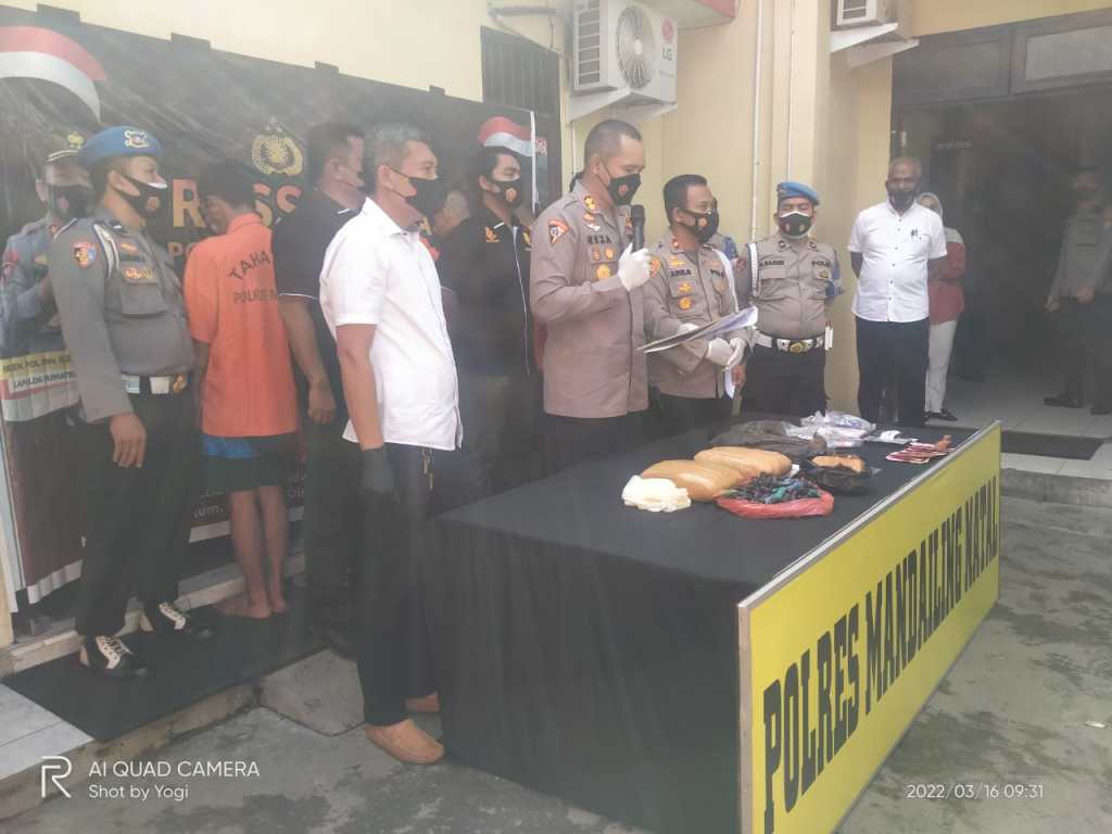 Kapolres Madina AKBP H.M. Reza Chairul, A.S, S.I.K, S.H, M.H memaparkan keberhasilan personil Satuan Unit Reserse Narkoba yang telah berhasil mengungkap dan mengamankan para pelaku tindak pidana Narkotika golongan satu jenis ganja dan sabu yang beroperasi di wilayah hukum Polres Madina, Rabu pagi Pukul 09.00 Wib, didepan Mako satuan reserse narkoba polres Madina (16/03/2022)