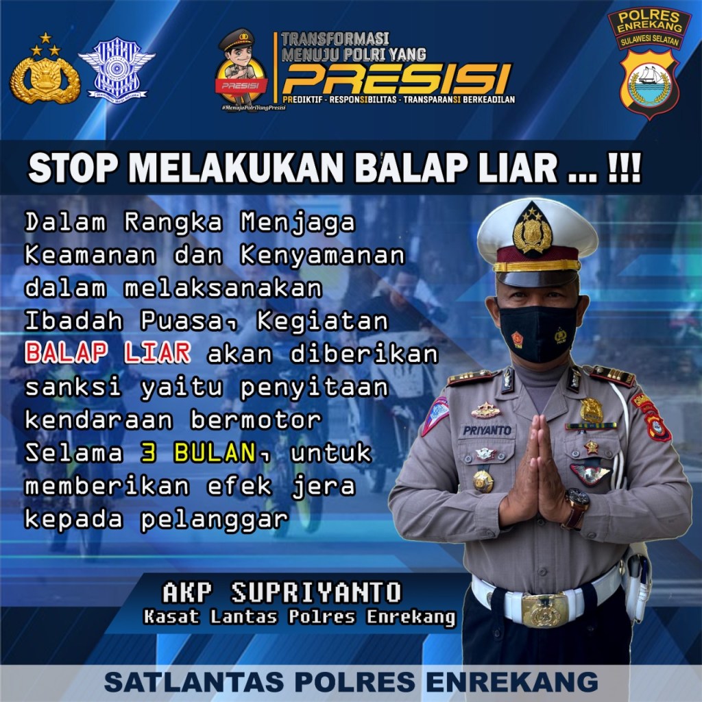 “Saya dengan personil Satlantas Polres Enrekang akan menindak keras apabila kami menemukan masyarakat Kabupaten Enrekang yang akan melakukan aksi ugal – ugalan, seperti freestyle atau balap liar pada jalanan umum pada saat bulan puasa nanti”. Ucap Kasat Lantas Polres Enrekang.
